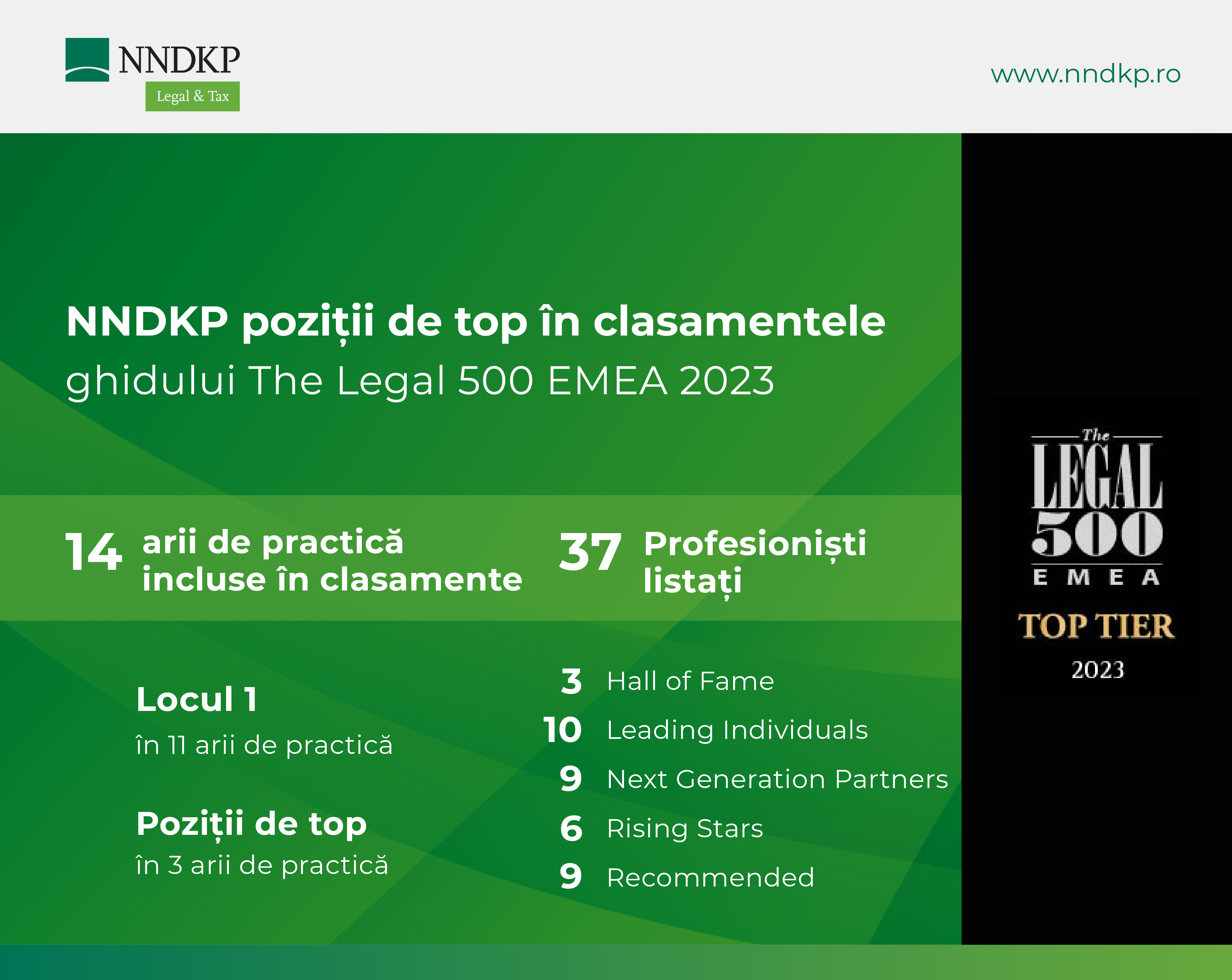 NNDKP a obținut 11 clasări pe primul loc și alte trei clasări pe poziții de top, în timp ce, la nivel individual, 37 de avocați și consultanți au fost incluși în clasamentele ghidului EMEA 2023 pentru România, fiind recunoscuți ca experți de top în ariile lor de practică.