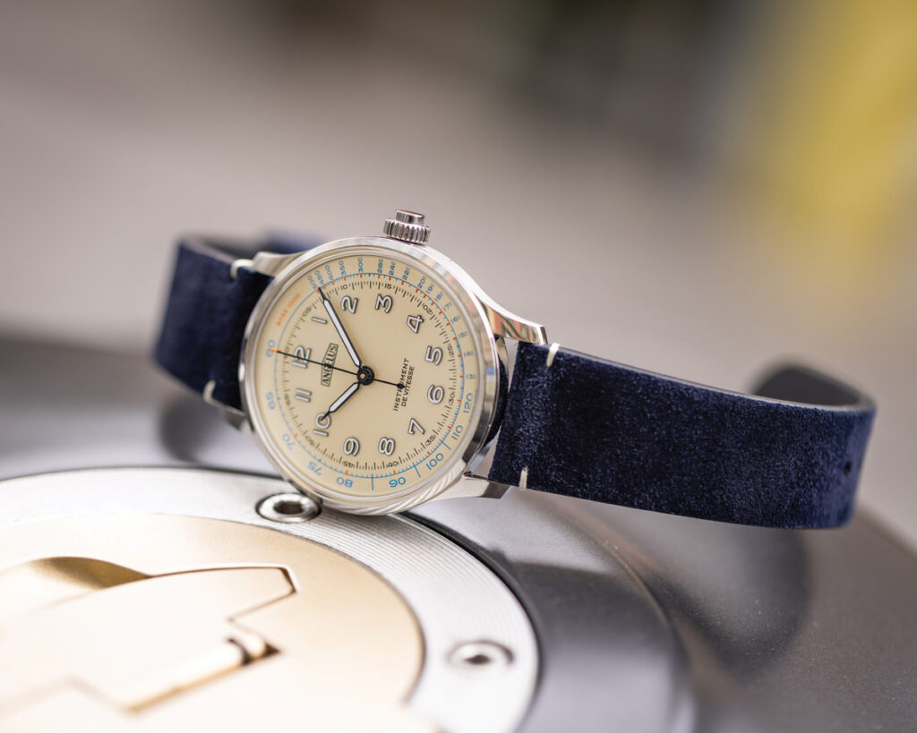 Unul dintre cele mai frumoase cronografe ale acestui sezon este, totodată, și acela care-și disimulează identitatea. Prima impresie pe care Angelus Instrument de Vitesse o lasă e de ceas vintage cu funcțiile clasice (ore, minute și secunde). Secundarul cu marcaj roșu și scala tahimetrică ne indică faptul că avem de-a face cu un cronograf monopusher, cu o cuantificare limitată la 60 de secunde. Calibrul cu întoarcere manuală A5000 este protejat de o carcasă de oțel cu diametrul de 39 mm. Modelul este disponibil în două variante de cadran, ivoriu și negru-abanos, ambele limitate la 25 de piese (17.100 de franci elvețieni), fiind al doilea cronograf din colecția La Fabrique (care readuce în atenție modelele de referință ale mărcii) după reeditarea superbului Chronographe Médical x Massena Lab.