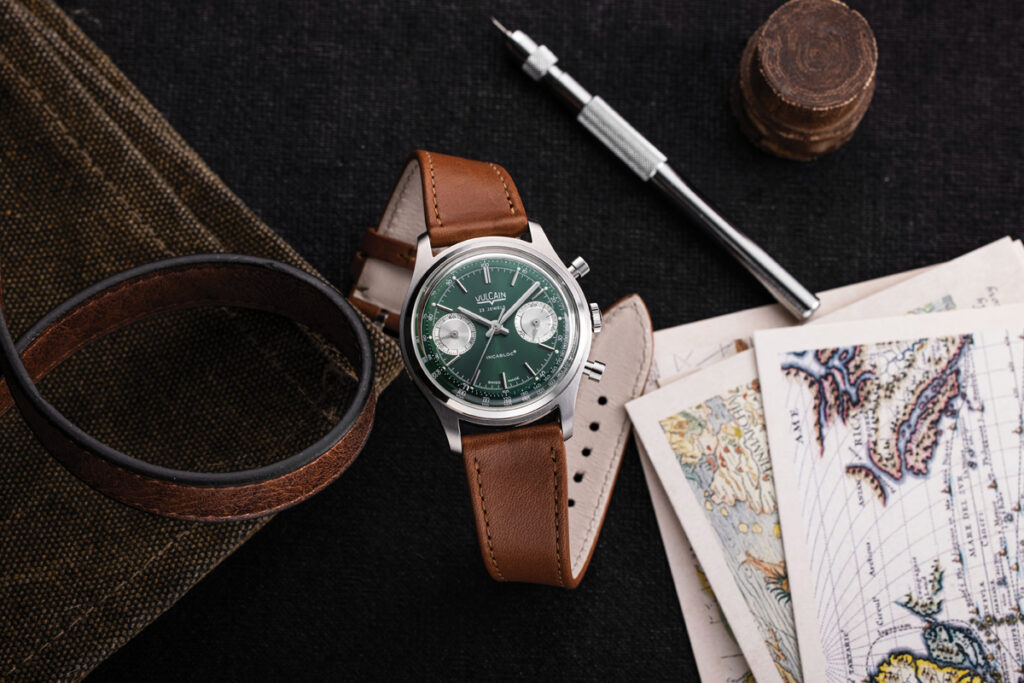 Și Vulcain pariază pe stilul retro, dar și pe fascinația pentru culoarea verde, pe care o regăsim tot mai des pe cadrane – de la ceasurile-bijuterie la instrumentele profesionale sau la creațiile superavangardiste. Nu ne-am plictisit de invazia de verde: culoarea e optimistă, iar bogăția de nuanțe valorificată, de la smarald la lime, de la chartreuse la malahit, imprimă mereu o notă personală în ciuda generalizării tendinței. Un verde sobru și sofisticat se adaugă cadranelor somon, albastre, negre, argintii-panda din colecția Chronograph 1970s. Noua versiune a cronografului bi-compax e limitată la 200 de piese, costă tot 2.500 de euro ca precedentele și, la fel ca ele, are o carcasă cu diametrul de 38 mm, mecanism cu întoarcere manuală Sellita, cu rezervă de mers de 63 de ore, și curea de piele de vițel.