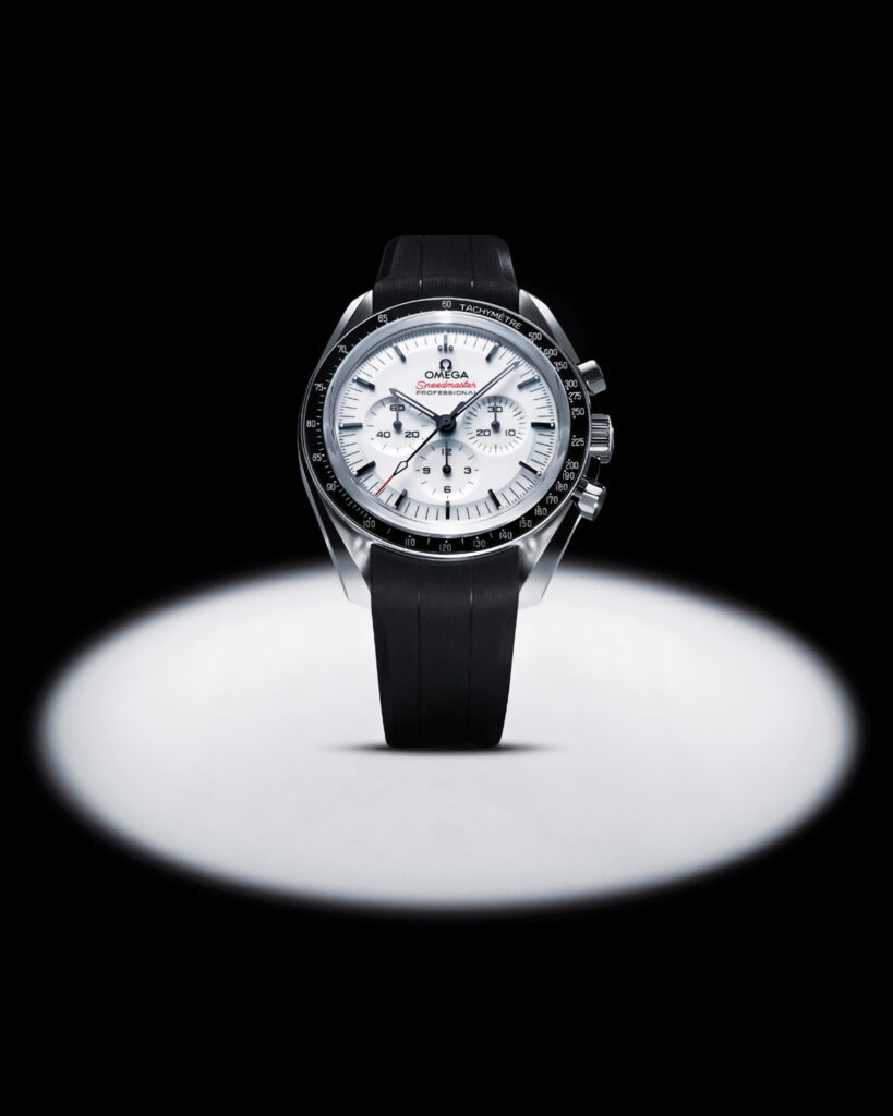 Cu un savuros look vintage-modern și o groază de referințe stilistice care trimit la o istorie inegalabilă, noul Speedmaster Moonwatch este o splendidă versiune a celui mai faimos cronograf. Așteptat încă din noiembrie trecut, când a fost expus strategic la încheietura lui Daniel Craig, la expoziția Planet Omega, de la New York, ceasul este disponibil acum la prețul de 9.000 de euro pentru varianta cu brățară de metal și de 8.600 de euro pentru cea cu curea de piele sau cauciuc. Este echipat, la fel ca restul pieselor din colecție, cu mecanismul cu întoarcere manuală Omega 3861, derivat din legendarul calibru 321 al ceasului purtat de membrii expediției Apollo 11. Amintind de edițiile Albino și Alaska I, noua versiune introduce cadranul alb lăcuit în colecția curentă Speedmaster Moonwatch.