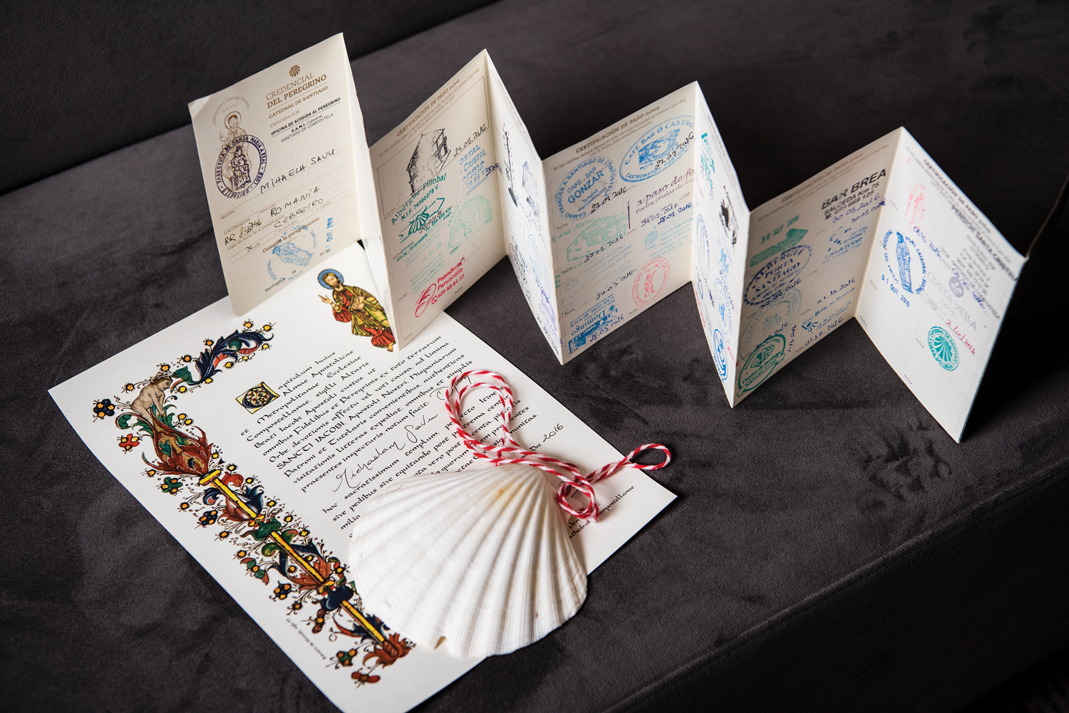 Mihaela se întoarce spre geantă în timp ce îmi povestește și scoate ceva ce seamănă cu o broșură subțire. „Acesta e credențialul meu: pe 24.09.2016 eram pe muntele Cebreiro (unde a scris Paolo Coelho) și s-a încheiat pe 1 octombrie 2016. Toate ștampilele de aici înseamnă o poveste. Pentru a fi recunoscut drept pelerin, trebuie să faci minimum 100 km pe jos și să te înscrii cu un scop; trebuie să respecți o anume rigoare.” Mă uit fascinată peste toate ștampilele și încerc doar să citesc printre ele. În cei 155 km parcurși de Mihaela trebuie să se fi strâns atâtea povești!