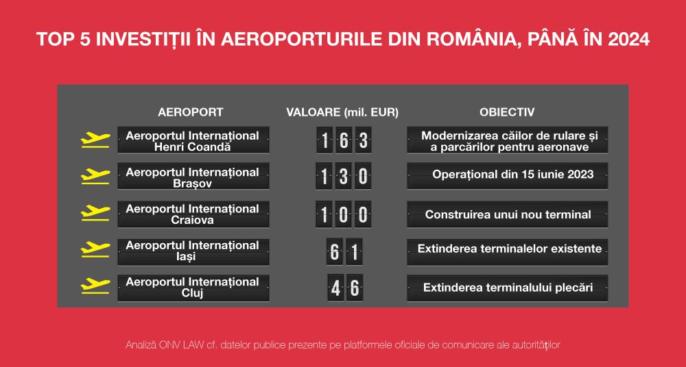 Potrivit datelor analizate de firma de avocatură ONV LAW, topul investițiilor este dominat de aeroportul Henri Coandă, care beneficiază de o investiție de 163 de milioane de euro.