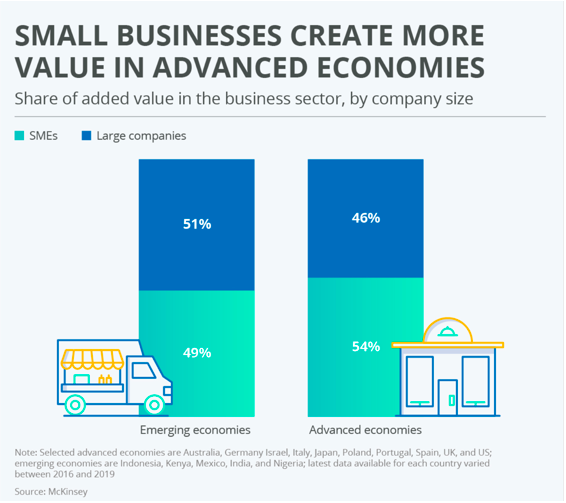 Afaceriile mici sunt responsabile pentru aproximativ jumătate din valoarea creată în economiile din întreaga lume, potrivit unui raport al Statista. Această pondere este chiar mai mare în economiile avansate decât în cele emergente. IMM-urile angajează mai mult de jumătate din forța de muncă globală, iar astfel succesul lor continuu este esențial atât pentru stabilitatea economică, cât și pentru creștere.