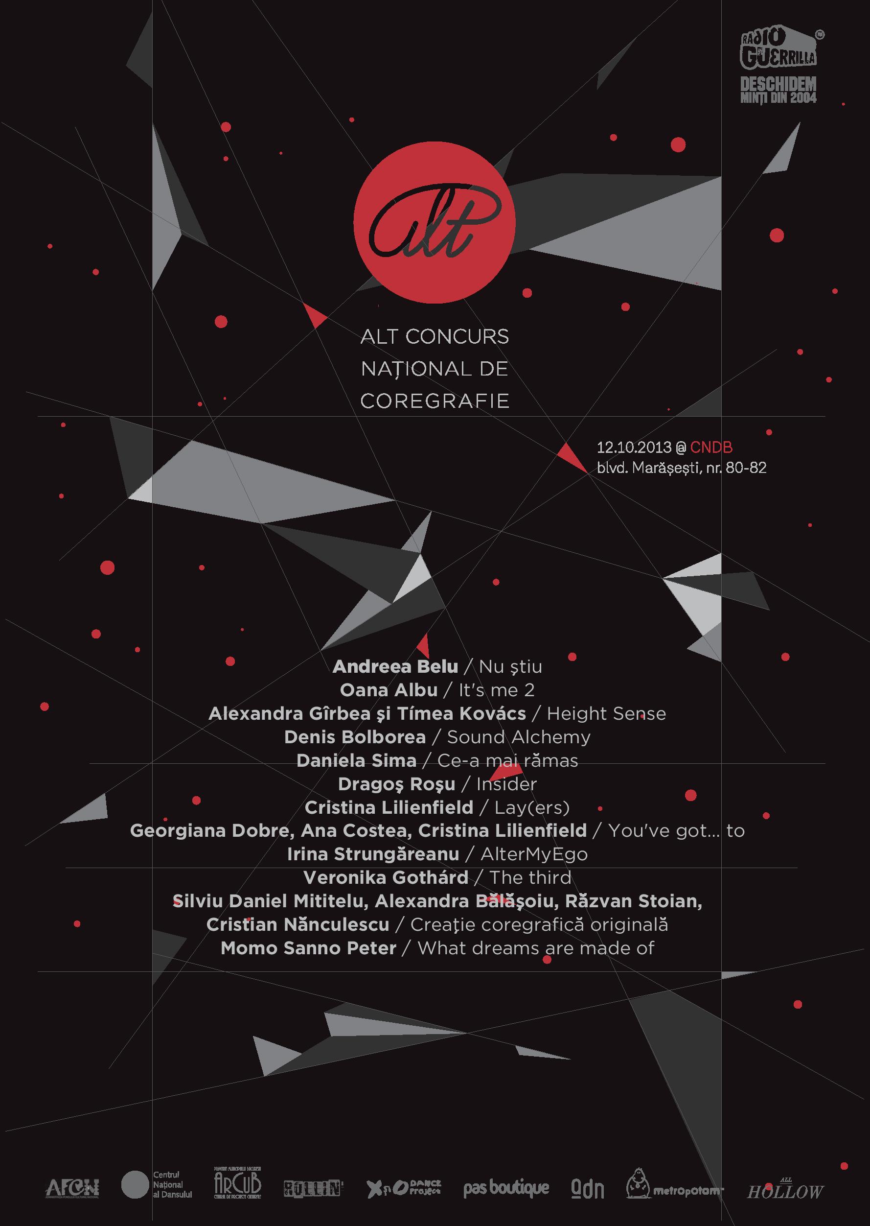 “Alt concurs…” este o competiție națională dedicată coregrafilor, dansatorilor și performerilor care vor aduce în atenția publicului,dar și a profesioniștilor, ultimele tendințe din dans și performance ce vor aborda mai multe stiluri de exprimare corporală, de la pop, abstract, teatral, până la experiment senzorial, video și sonor. Evenimentul va pune în scenă 13 producții independente noi, majoritatea autofinanțate, ce reunesc peste 50 de coregrafi, dansatori, performeri, actori și muzicieni români.