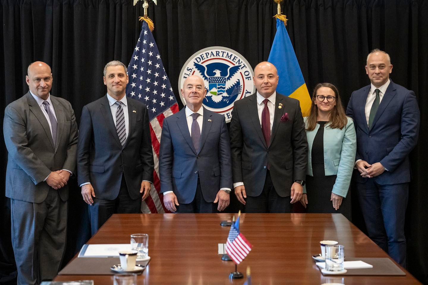 Foto: US Department of Homeland Security – DHS / Delegația americană: Alejandro Mayorkas, DHS Secretary; Robert Silvers, Under Secretary, Office of Strategy, Policy, and Plans; Robert Paschall, Deputy Under Secretary (Acting) Office of Strategy, Policy, and Plans / Delegația română: Andrei Muraru, Ambasador; Cristian Gaginsky, Prim-colaborator; Teodora Drăgulescu, Secretar II.
