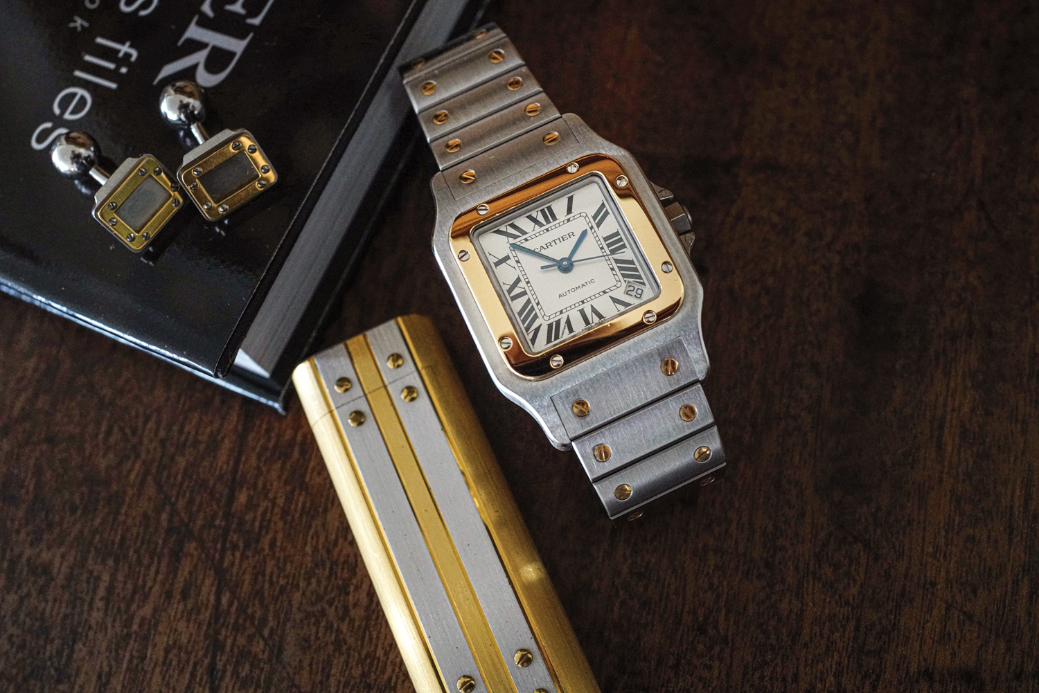 Santos din oțel și aur! Așa cum am spus, Santos este primul ceas Cartier pe care mi l-am cumpărat și, în ciuda faptului că este modelul cu prețul cel mai mic dintre toate cele pe care le am, îl port cel mai mult. Dar cel pe care îl port acum este mai nou, din 2005. Nu există niciun ceas în care aurul și oțelul să se combine mai frumos. Liniile Santos și Santos Dumont au, în integralitate, un caracter foarte puternic și masculin.