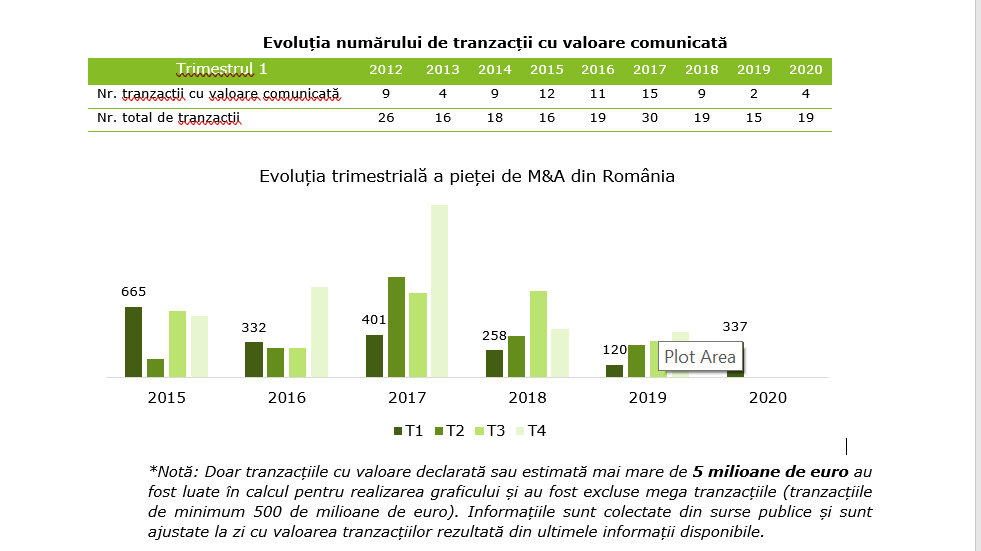 Potrivit estimărilor Deloitte, valoarea totală a acestora, inclusiv tranzacțiile care nu au avut o valoare comunicată, a fost de 600-750 de milioane de euro în T1 2020 (față de o valoare între 200 și 300 milioane de euro în T1 2019), în timp ce tranzacțiile comunicate au totalizat 337 de milioane de euro (120 de milioane de euro în T1 2019).