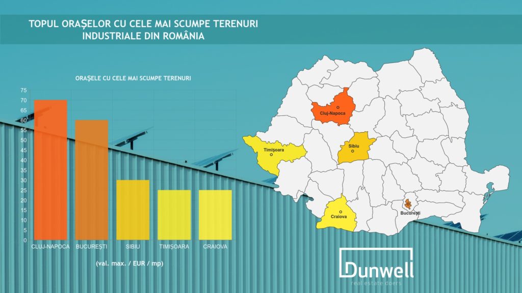 Potrivit datelor Dunwell, Cluj-Napoca, București, Sibiu, Timișoara și Craiova sunt orașele cu cele mai ridicate prețuri când vine vorba de achiziția unui teren ce vizează o viitoare dezvoltare industrială.