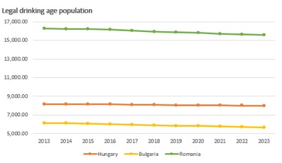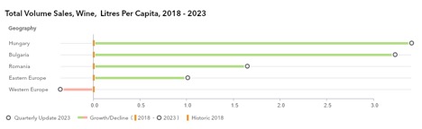 România se situează pe locul trei din punctul de vedere al potențialului de creștere în volum al vinului consumat pe cap de locuitor până în anul 2023, dupa Ungaria și Bulgaria, în ciuda fenomenului de scădere a populației ajunse la vârsta majoratului.