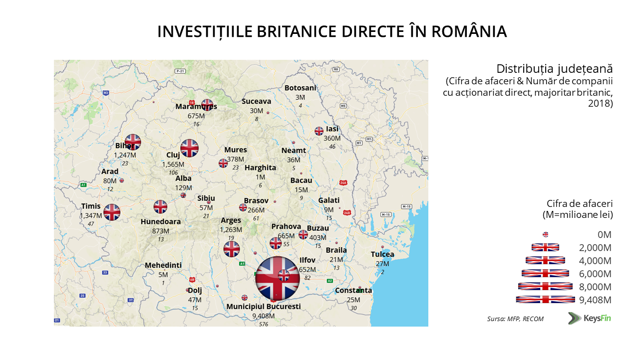 Cei mai mulți investitori britanici din România aleg Capitala, astfel că, din punct de vedere geografic, Bucureștiul se află pe primul loc în clasamentul celor mai consistente investiții britanice directe, cu o cifra de afaceri cumulată de peste 9,4 miliarde de lei, care constituie aproximativ 47% din total. Următoarele județe în clasamentul celor mai mari investiții britanice directe sunt: Cluj (1,6 miliarde de lei și 8% din total) și Timiș (1,3 miliarde de lei și 7% din total).