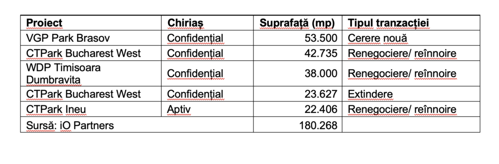 Cele mai mari cinci tranzacții de închiriere în primele nouă luni totalizează 180.000 mp în zone precum Brașov, București-Ilfov, Timiș și Bihor.