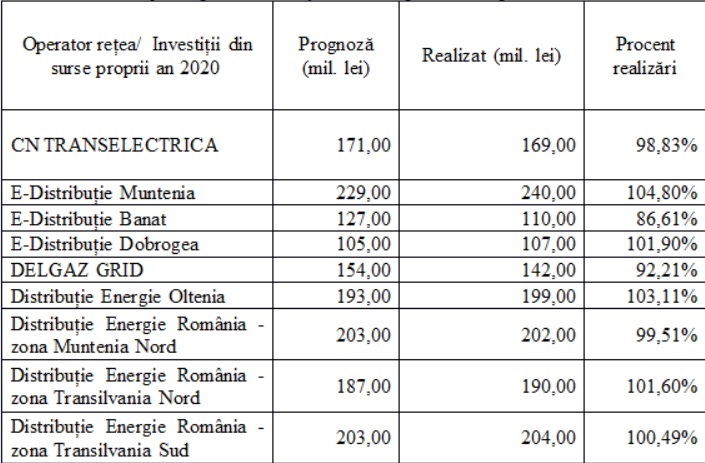 E-Distribuție Banat a fost distribuitorul care a avut cel mai mic procent de realizare a investițiilor (86,6%), iar E-Distribuție- Muntenia cel mai mare grad de realizare (104,8%).