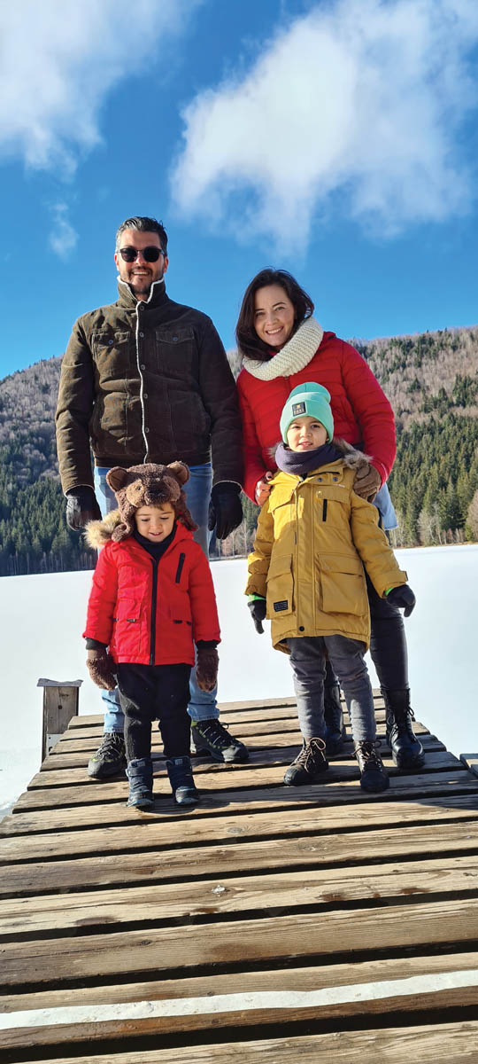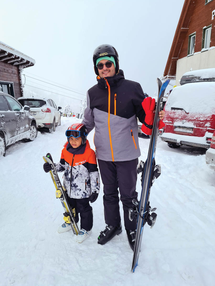 De la această vacanță de iarnă am avut două așteptări: peisaje rupte din povestea Crăiasa Zăpezii, cu brazii plini de zăpadă, și pârtii libere pentru a putea să luăm primele lecții în liniște și fără stres. Și ambele așteptări ne-au fost depășite. Am ajuns în zona Harghita într-una dintre cele mai geroase perioade din 2021, cu temperaturi sub -20 de grade Celsius. Înainte să plecăm la drum am făcut o oprire la un magazin de specialitate pentru a ne echipa corespunzător. Ne-am luat cu toții un strat de bază din lână merinos, șosete speciale pentru schi, bluze polar, cagule, mănuși de schi și salopete. Știu că suntem tentați să credem că „merge și așa“, dar un echipament potrivit poate transforma o vacanță frumoasă într-una minunată. Nu numai că nu am simțit frigul, dar copiii au stat toată ziua pe pârtie și în zăpadă, fără să comenteze sau să se plângă de frig.