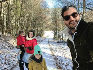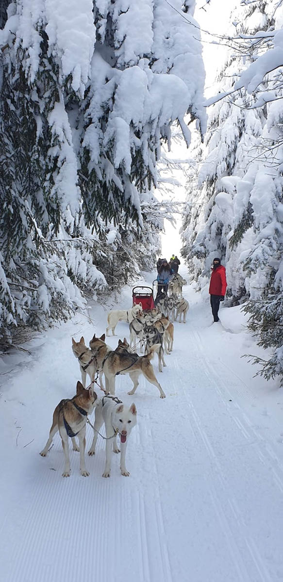 Una dintre cele mai așteptate experiențe pentru copiii noștri a fost clar plimbarea cu sania trasă de câini husky. Este un mic business de familie pornit din pasiunea pentru cursele cu atelaje canine. În timpul sezonului de iarnă, familia Baroti oferă turiștilor posibilitatea de a experimenta o plimbare cu sania trasă de câini, printre brazii seculari, pe poteci doar de ei știute și prin iarna de poveste din Harghita, sub numele Huskytoursharghita. Punctul de pornire este în comuna Ciumani, în județul Harghita, sau la Harghita Băi, unde îi găsiți în weekend, când au mulți turiști. Întreaga experiență începe cu drăgălitul fiecărui cățeluș în parte, extrem de dornici să fie mângâiați și foarte ascultători.