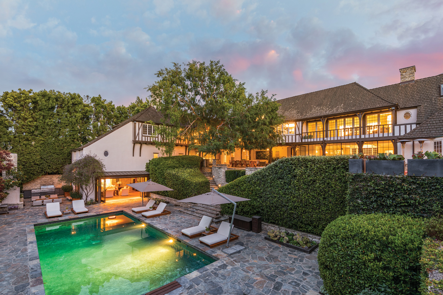 Printre piesele de rezistență ale conacului Beverly Hills se numără livingul spațios, cu podea din lemn de stejar și ferestre până la tavan, care oferă o priveliște uimitoare către aleile din curte pavate cu piatră și către vegetația luxuriantă din jur. Exteriorul este la fel de frumos amenajat precum interiorul. Terasele ample și dichisite te îmbie să iei masa sau, pur și simplu, să te relaxezi la aer pe un fotoliu sau pe șezlong.