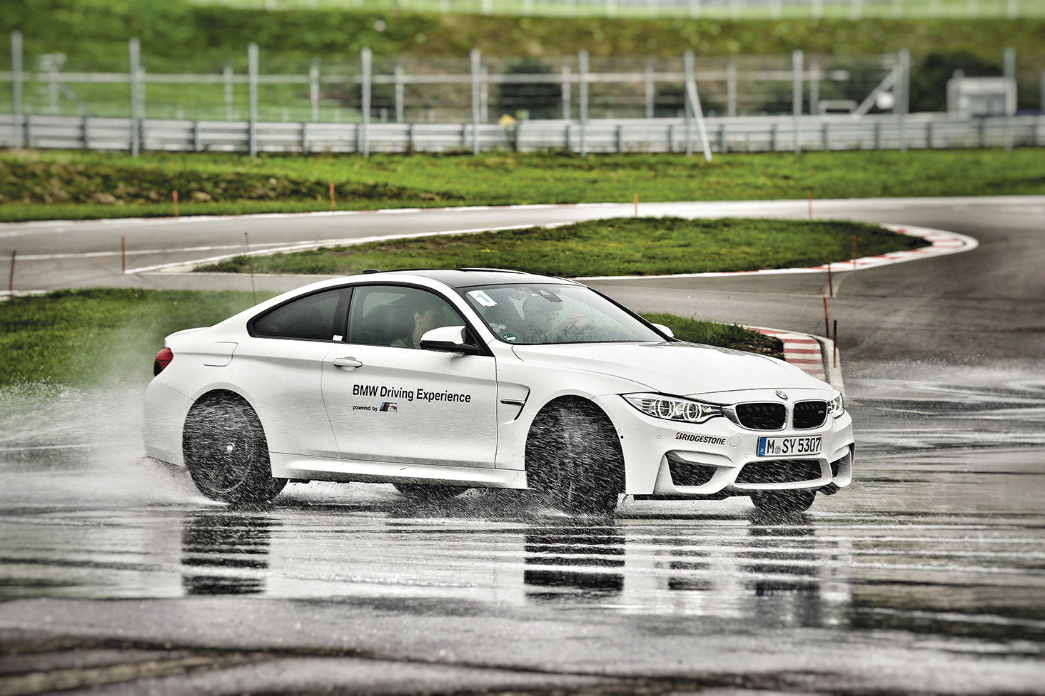 Am început ziua, din păcate sau din fericire, cu exercițiul de drift. Nu mai condusesem un M4 până acum și nu eram obișnuit cu puterea, aderența și manevrabilitatea mașinii. Am avut și „norocul“ să intru primul în cercul special, amenajat cu porțiuni de asfalt care simulau condiții de ploaie, alternate cu zone uscate unde aderența se modifica brusc. A fost singurul moment în care instructorul nostru ne-a lăsat să decuplăm sistemul DSC (controlul dinamic al stabilității) pentru a rupe aderența și a încerca să facem derapaje controlate.