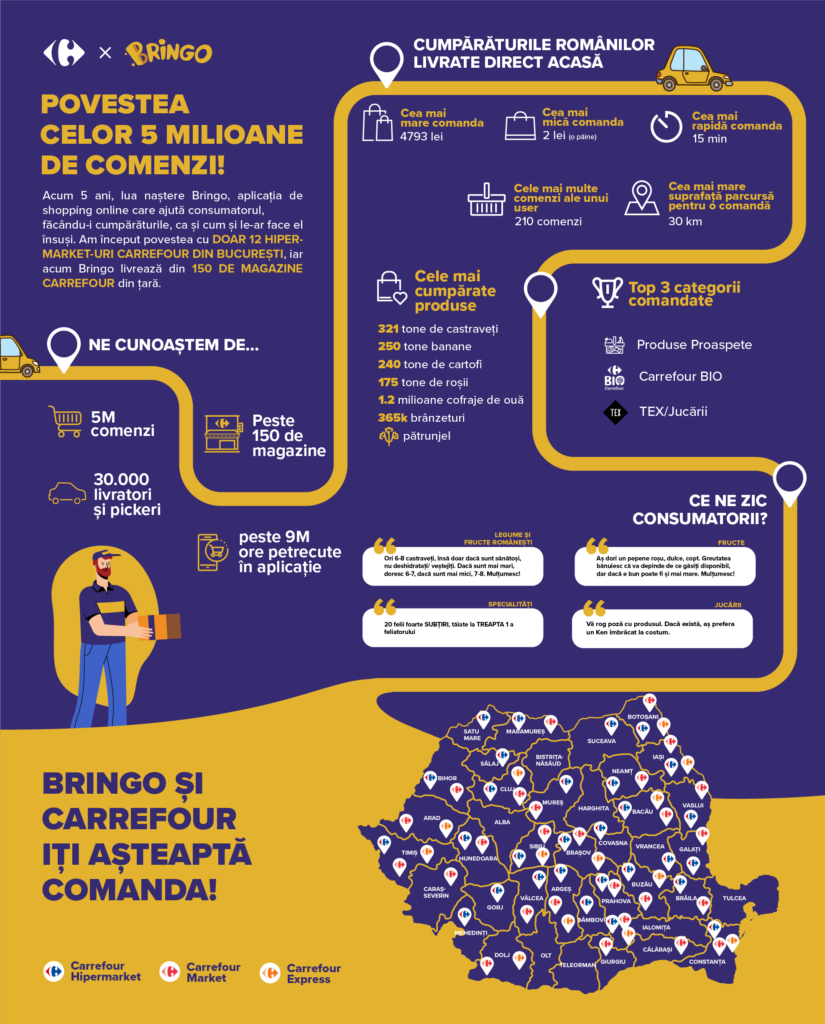 După 5 ani de colaborare și prezență pe piața e-commerce din România, Carrefour și Bringo sărbătoresc 5 milioane de comenzi plasate în aplicație. Acestea se traduc, mai departe, în peste 10 milioane de accesări și 750.000 de mesaje lăsate în aplicație de utilizatori pentru echipele de livratori Bringo și pickeri Carrefour, care îndeplinesc rolul unor „personal shopperi”. În topul produselor comandate de la cele peste 150 de magazine Carrefour integrate în aplicație în toate formatele – Hipermarket, Market, Express și Supeco – se numără apa îmbuteliată, castraveții, bananele, dar și pătrunjelul românesc, demonstrând interesul consumatorilor pentru produse proaspete.