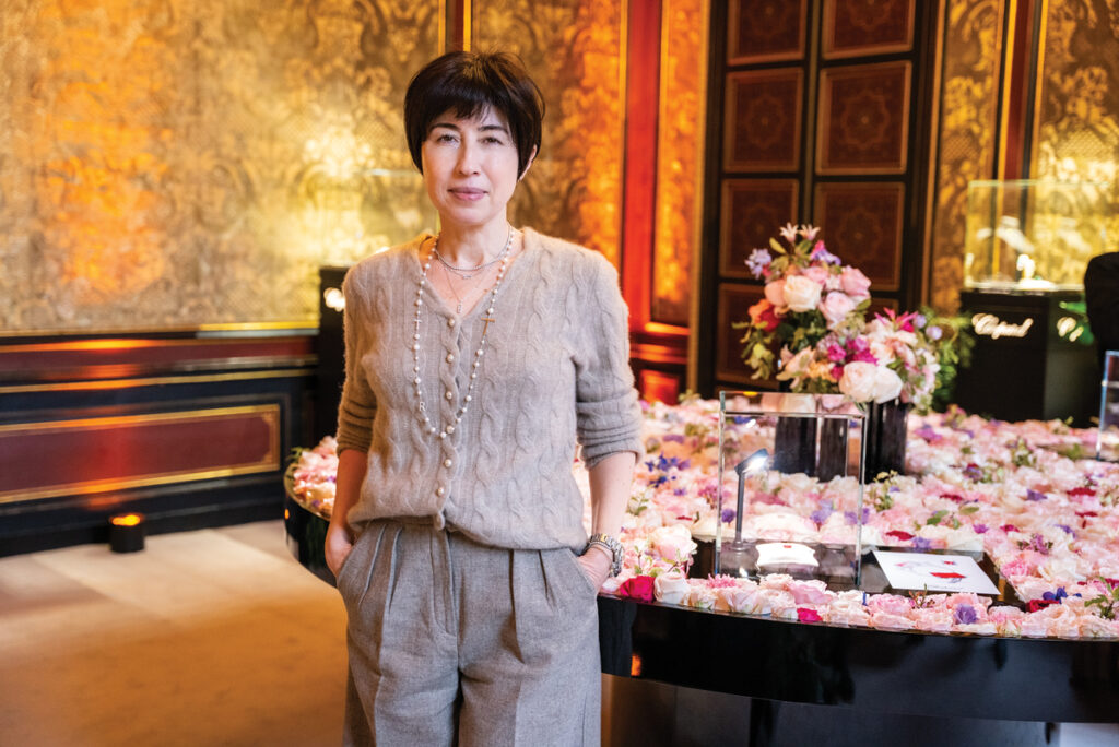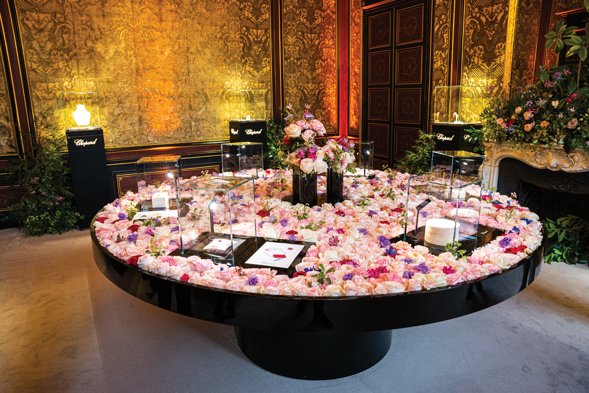 Am început cu Chopard, unul dintre cele mai frumoase branduri de bijuterii, care și-a prezentat colecția la Hôtel d’Évreux, o superbă clădire „vendomiana”, ascunsă în spatele Hotelului Ritz și care, cu ocazia prezentării de pietre și bijuterii prețioase, a fost, pur și simplu, invadată de trandafiri – de la scara majestuoasă îmbrăcată în flori până la mobilierul superb pe care diamantele colorate, safirele și turmalinele erau expuse într-un ocean de trandafiri.
