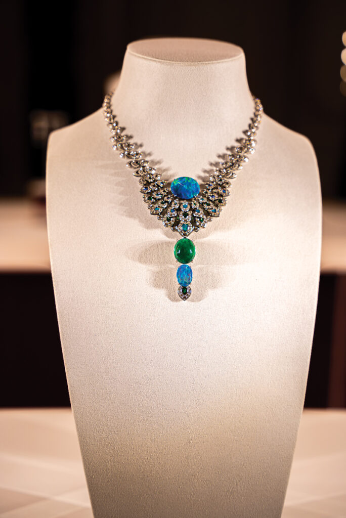 Colierul Ocelle este o combinație, deja clasică la Cartier, între verde și albastru, trimitere clară la penajul păunului – două opale, unul de aproape 17, iar celălalt de aproape 7 carate plus un smarald de aproape 22 de carate sunt responsabile pentru o piesă care va trece cu brio orice test al istoriei.