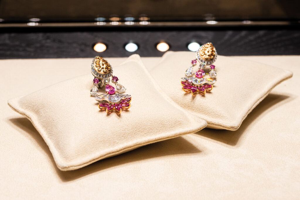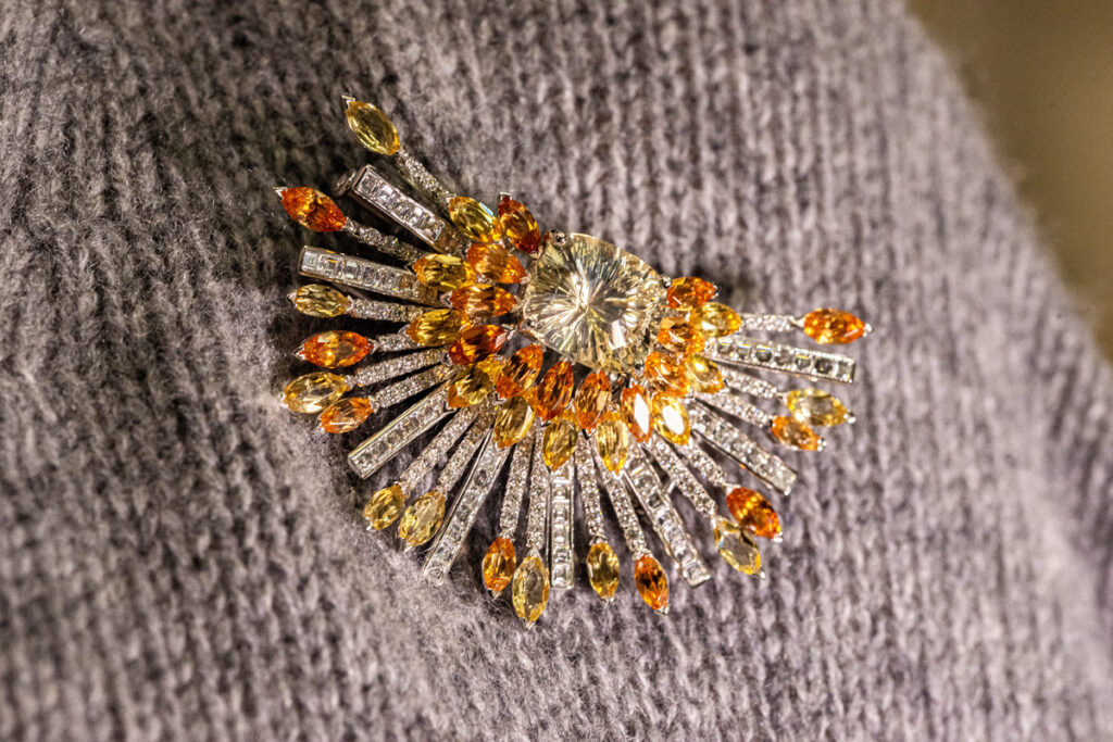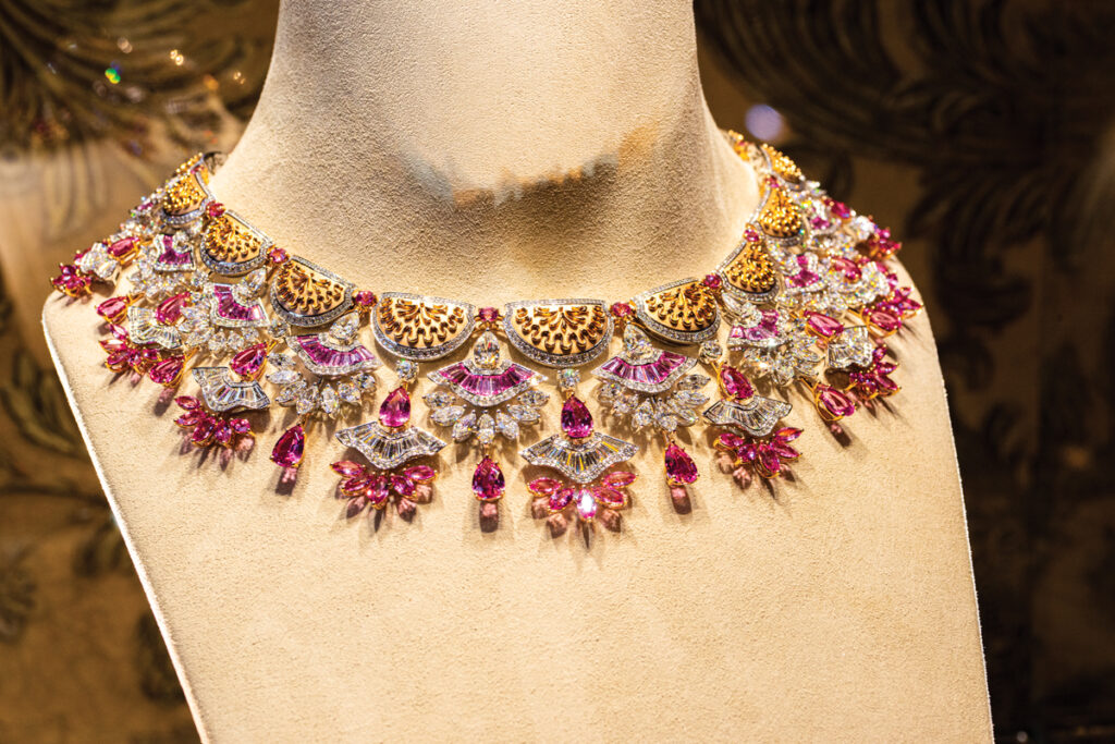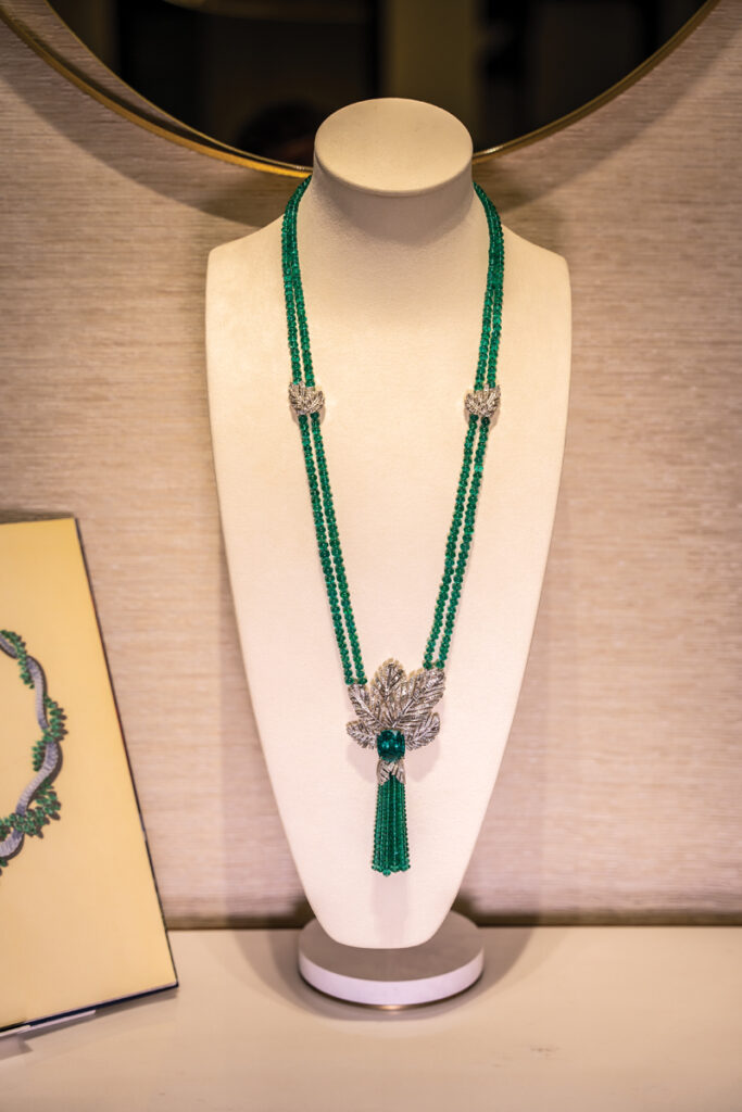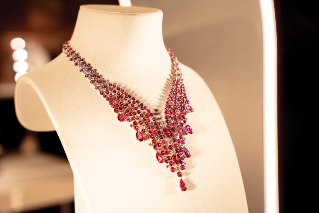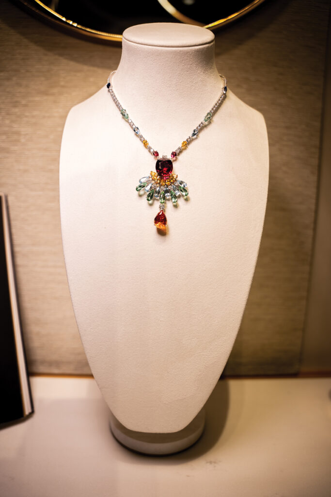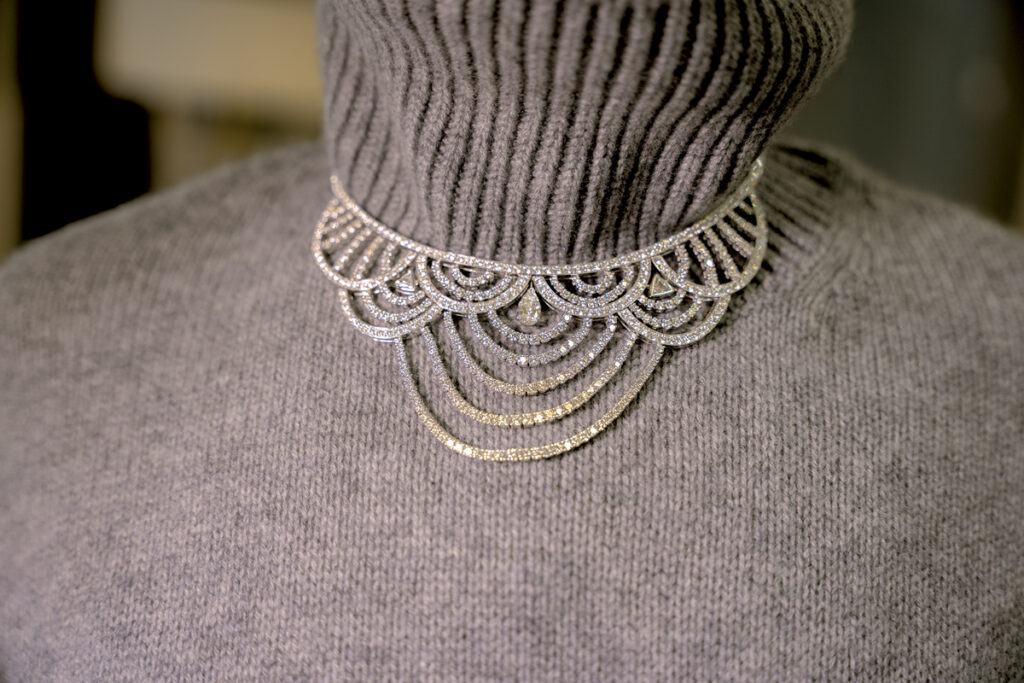 Tot pe puloverul meu gri s-a potrivit și dantela de diamante din colierul Play of Lights, inspirat de arhitectura orientală – acele moucharabiehs prin care poți vedea fără a fi văzută – în total 518 diamante și aproape 30 de carate. Superb colierul Secret Oasis, ale cărui smaralde trimit la răcoarea de la umbra palmierilor din oazele deșertului. Iar Limelight Rose Passion este definiția unui colier… delicios: rubelit, turmaline, spessartit, safire – o combinație de culori și nuanțe vesele, ca penajul unui papagal foarte vorbăreț.