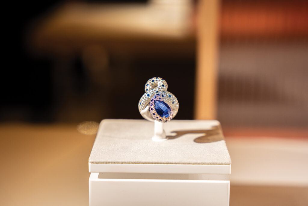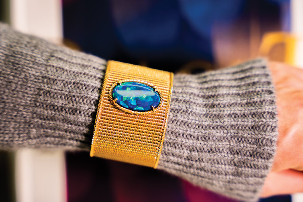 Broșa spectaculoasă Underneath the Sun poate fi purtată și ca pandant și strălucește cu toate caratele de safir, spesartin, beril și diamant. E un fel de mic soare la purtător, care a înveselit imediat puloverul meu gri. Nu m-aș mai fi despărțit nici de brățara Limelight Mediterranean Garden, care mi-a prins bine încheietura într-o îmbrățișare din aur „răsucit” și care m-a făcut să mă gândesc la Riviera Franceză a anilor ’60, când parcă totul era bucurie, soare și stil. Piesa de rezistență este opalul negru, o piatră superbă cu irizații verzi și albastre care parcă dansează într-o lume secretă.