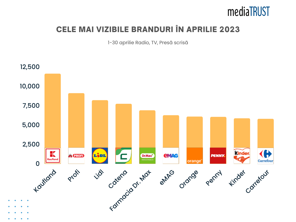 Analiza de monitorizare mediaTRUST, realizată în perioada 1-30 aprilie 2023, arată că brandul Kaufland a fost lider în topul celor mai vizibile branduri la nivelul televiziunii și radioului. Profi s-a clasat pe locul doi, iar Lidl a completat podiumul de pe poziția a treia.