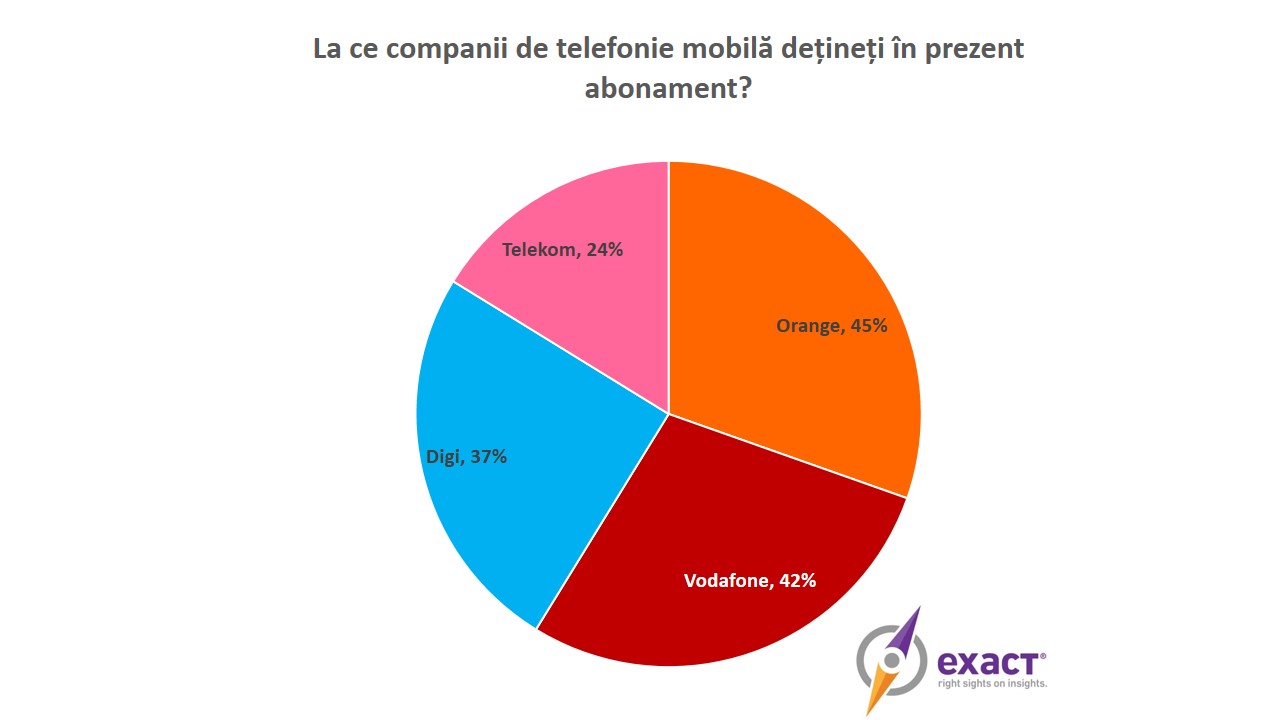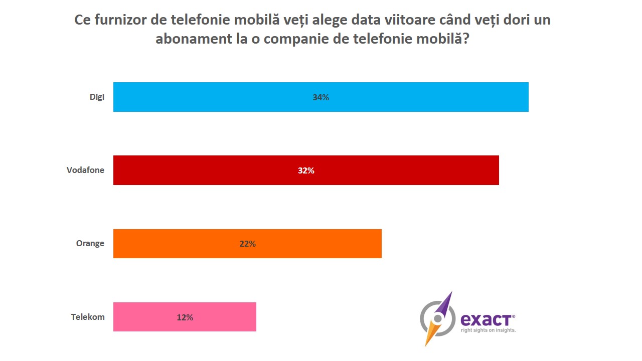 Întrebați la ce companie de telefonie mobilă vor apela în viitor, în vederea încheierii unui abonament, românii și-au manifestat interesul față de Digi și Vodafone, cu 34% și, respectiv, 32%. Orange reprezintă opțiunea viitoare a 22% dintre români, în timp ce Telekom a doar 12%.