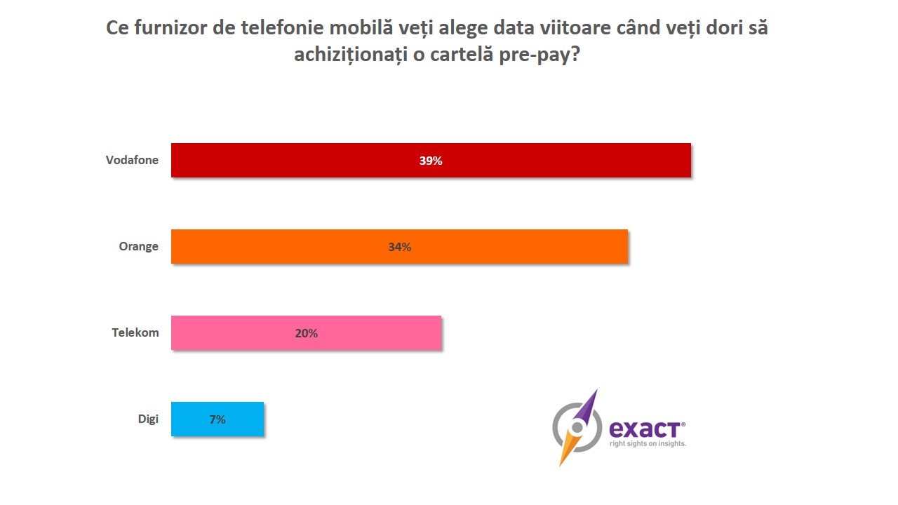 Dacă Digi reprezintă prima opțiune a românilor atunci când ne referim la abonamente viitoare, compania coboară pe ultima poziție atunci când este adusă în discuție achiziția viitoare de cartele pre-pay: 7%. Primii 3 operatori de telefonie preferați sunt în acest caz Vodafone (39%), Orange (34%) și Telekom (20%).