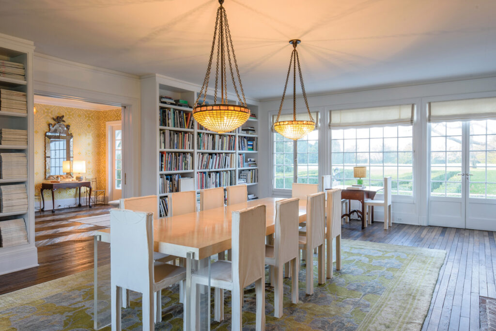Casa, cu o suprafață de aproape 800 de metri pătrați, are podele din lemn de esență tare, tavane cu grinzi aparente și ferestre mari. Glasvandurile numeroase fac ca livingul să fie scăldat în lumină naturală. Un șemineu și pereții cu rafturi cu cărți dau o notă de intimitate camerei de servit masa.