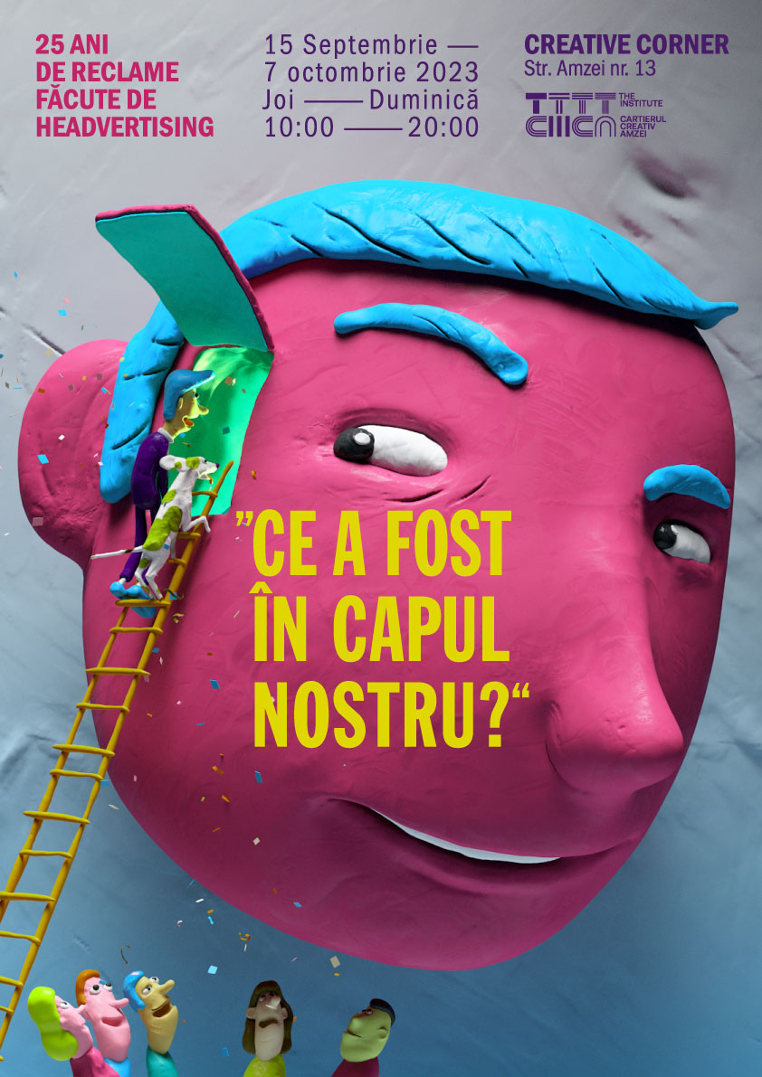 Expoziția „Ce-a fost în capul nostru?”- 25 ani de reclame făcute de Headvertising va fi deschisă la galeria Creative Corner (str. Amzei, nr. 13) din București, între 15 septembrie și 7 octombrie. Aceasta va fi deschisă în fiecare săptămână de joi până duminică, între orele 10:00 – 20:00.
