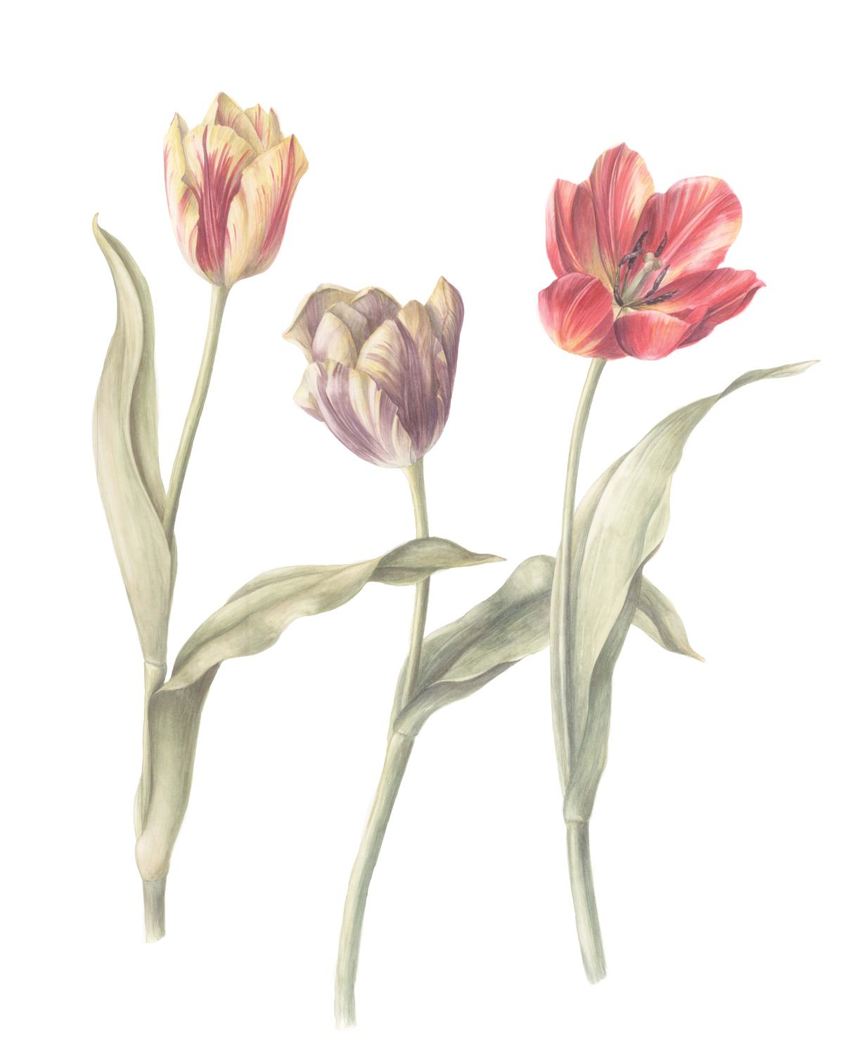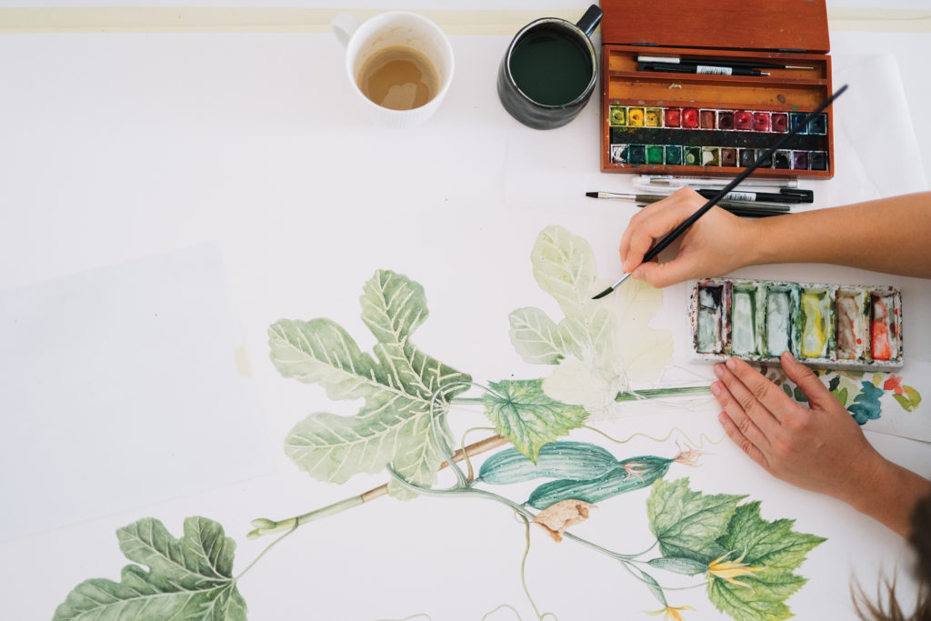 Subiectul florilor este într-un fel de purgatoriu al artei, pentru că este prea aproape de reprezentări kitsch naturaliste, prea departe de arta clasică și cu o poziție incertă în arta contemporană, între estetic, senzorial și reflectiv. Am ales să pictez flori într-un moment în care nu aveam nevoie de o monetizare a acestei activități mai degrabă recreative. Probabil așa se întâmplă, pe bune, și nu numai în cărțile motivaționale, odată ce anulezi presiunea și viziunea finalității, drumul în sine se îmbogățește cu experiențe nebănuite. Am aflat despre arta botanică din mers, am studiat mult alături de profesori buni, am investit în ceea ce se simțea bine intuitiv. Nu știu de unde vine pasiunea pentru plante, este cu mine de când mă știu. Acum pot spune că arta botanică este meseria mea, care nu ar fi fost posibilă fără facultatea de arhitectură, fără experiența tehnică și fără networkul creat prin proiectele anterioare. Fără a cocheta cu misticismul, totul are sens. La Arhitectură am căutat specializarea restaurare, în dorința de a lua contact direct cu materialul brut – însă nu am găsit, atunci, prea multă aplicabilitate, nu că nu ar fi fost nevoie. Așadar, m-am apucat din nou de școală, de data asta am ales Arte Plastice, la Roma, secția Design Interior – să fie (din nou) o alegere logică. Însă cam toate creditele au fost făcute la catedrele de pictură și gravură. M-am întors în țară și am început să lucrez și să gravitez în jurul acestui design interior, pentru care aveam cunoștințele necesare și care oferea creativitate. În plus, la Roma, încercarea de a picta flori, venită și acum natural, a fost stopată de tutorele meu, care mi-a spus că florile nu sunt vandabile și nu reprezintă un subiect modern. Probabil că toată nevoia mea de hârtie, plante și desen a rămas latentă până când m-am simțit suficient de stăpână pe mine, încât să mă întreb: „OK, și dacă o vreme aș face exact ce simt eu și nimic mai mult, ce s-ar întâmpla?”