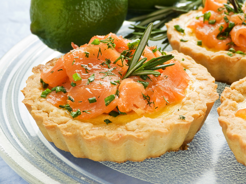 Transferă fiecare bază de tartă pe o farfurie (este mult mai ușor decât să le muți după aceea). Toarnă niște cremă de hrean pe fiecare tartă, adaugă somonul afumat, bucățele de ceapă murată (nu și lichidul scurs). Presară caviar de somon, măcină puțin piper negru și servește-le alături de câteva felii de lămâie.