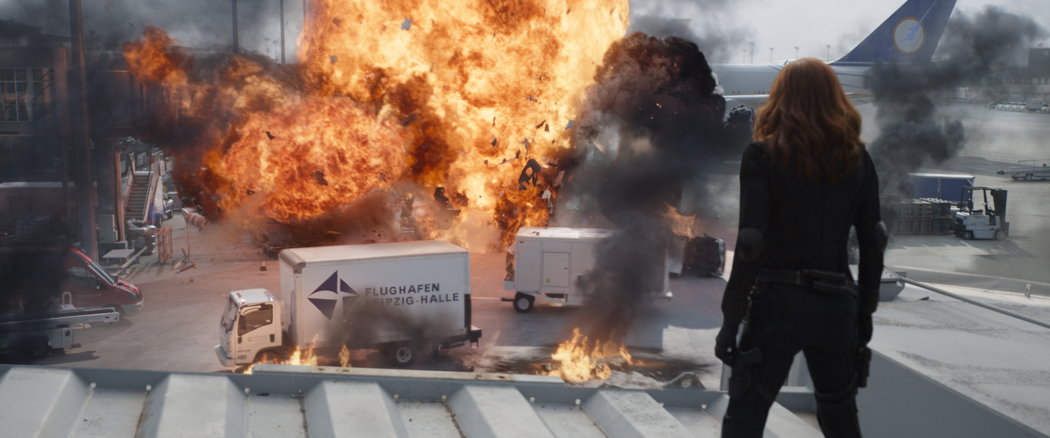 Scena care a rupt în două tagma Răzbunătorilor este una dintre cele mai bune scene epice dintr-un film Marvel, deoarece, fiind filmată cu o cameră IMAX, creează senzația publicului că e în mijlocul acțiunii. Producătorii au numit-o „Splash Panel”, deoarece le aduce aminte de paginile dublu ilustrate din cărțile de benzi desenate.