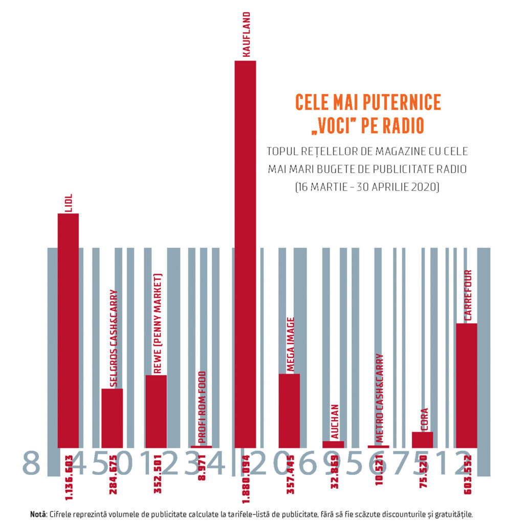 Televiziunea nu a fost singurul suport de promovare pentru advertiserii din categoria retail alimentar. Radioul a fost „prietenul care la nevoie se cunoaște”, conform vechiului proverb. În perioada 16 martie – 30 aprilie 2020, bugetul de publicitate investit în principalele 12 rețele de radio din țară a fost de 3,3 milioane de euro (calculat la rate card), conform monitorizărilor Biroului Român de Audit Transmedia (BRAT). Acest volum a reprezentat 18% din totalul investițiilor în publicitatea radio, în perioada analizată, și este mai mic cu 42,6% față de cel din același interval a anului trecut. Cei mai mari consumatori de publicitate radio au fost Kaufland (1,8 milioane de euro – rate card), Lidl (1,2 milioane de euro – rate card) și Carrefour (603.552 euro – rate card). Radiourile cu cele mai mari venituri de publicitate din partea magazinelor au fost Europa FM (648.783 euro – rate card), Radio ZU (555.716 euro – rate card) și Kiss FM (527.941 euro – rate card).