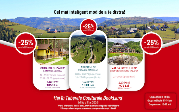 Perfect! Avem soluția, zicem noi, Asociația BookLand, care am lansat acum 7 ani Taberele Coolturale BookLand – un concept unic, care îmbină atmosfera taberelor de odinioară, pline de aventură și distracție cu activitățile educative într-un format cool. Lansate acum 7 ani, Taberele Coolturale BookLand oferă copiilor cu vârste cuprinse între 6 și 18 ani (nu și părinţilor, deși unii insistă) un mix echilibrat: un sfert tabără „clasică” (cu sport și drumeții în natură), un sfert excursie culturală, un sfert workshops și ateliere practice cu personalităti importante și un sfert distracție cât cuprinde…