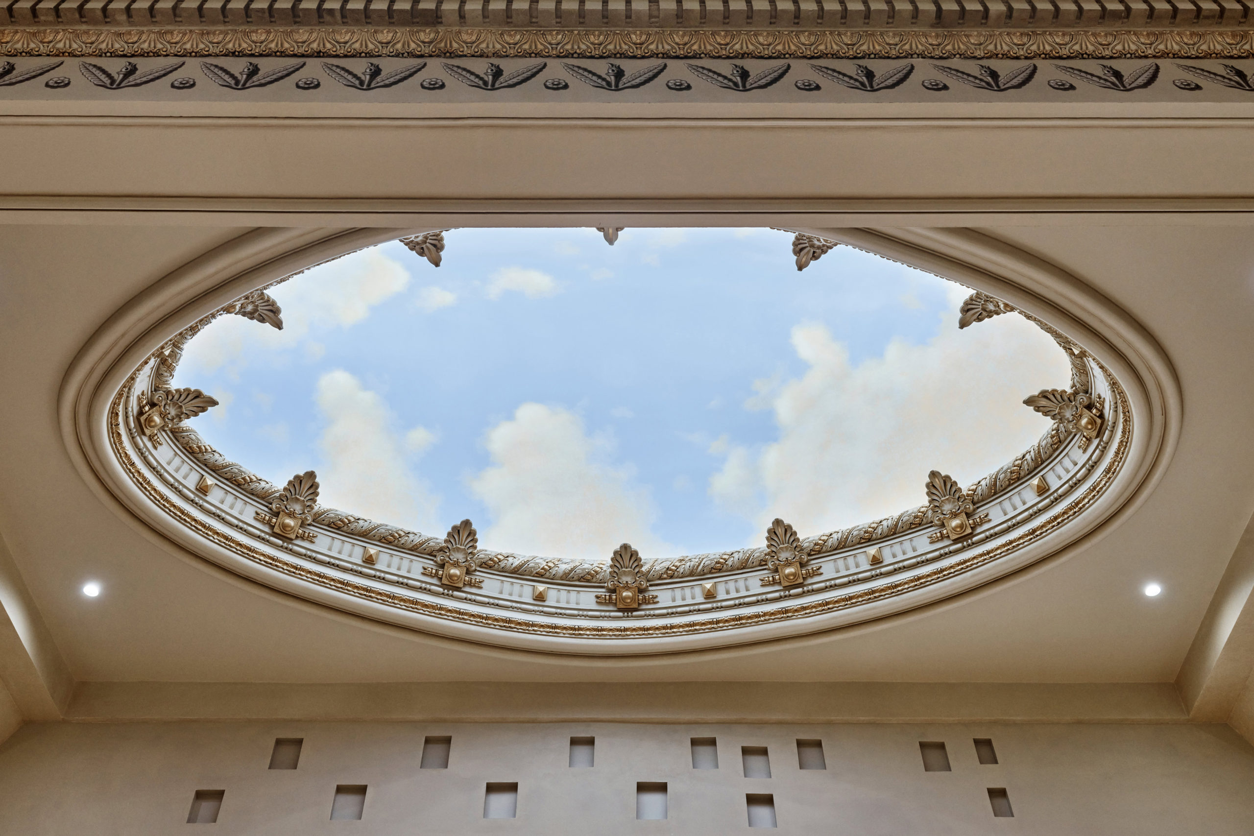Au fost scoase astfel la iveală minunatele vitralii ale ferestrelor, sculpturile murale, detaliile din bronz impecabil lucrate ale scării din holul principal și pictura de pe tavan, reprezentând cerul albastru al Californiei. Băncile de pluș sunt asemănătoare cu cele din sala de spectacole din Apple Park, păstrând însă ceva și din aspectul fotoliilor din vechiul cinematograf, așa cum a fost el identificat în imaginile de arhivă.