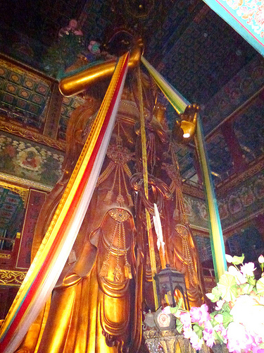 După cei trei ani cât a durat transportul trunchiului la Beijing (în secolul al XVIII-lea), sculptura şi „tapetarea“ cu 2,5 kilograme de foiţă de aur a mai luat încă trei ani.În cele din urmă, pavilionul a fost construit în jurul imensului Buddha înalt cât un bloc de cinci etaje.