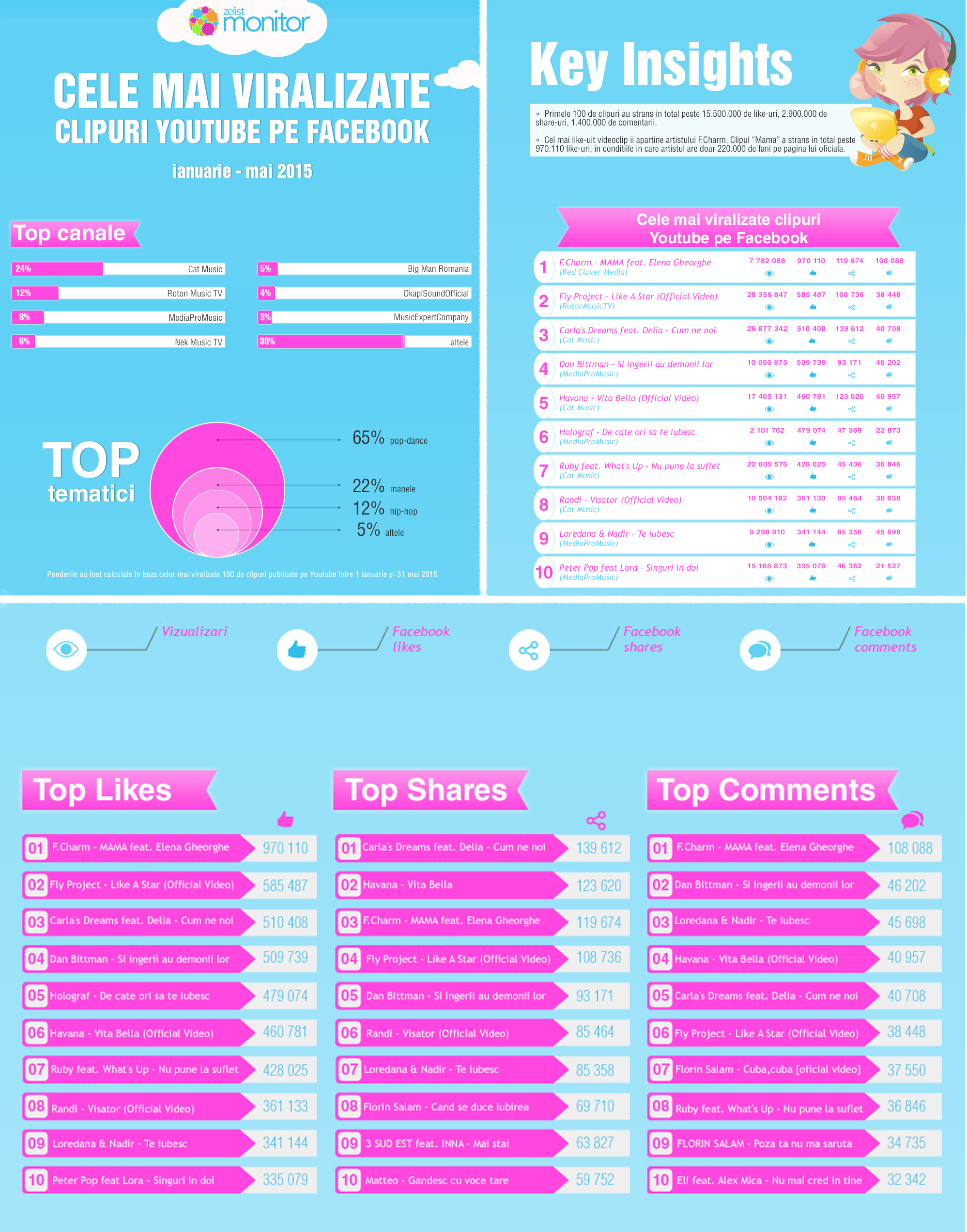 Cel mai like-uit videoclip din această perioadă îi aparține artistului F.Charm. Clipul „Mama” a strâns în total peste 970.110 like-uri, în condițiile în care artistul are doar 220.000 de fani pe pagina lui oficială.