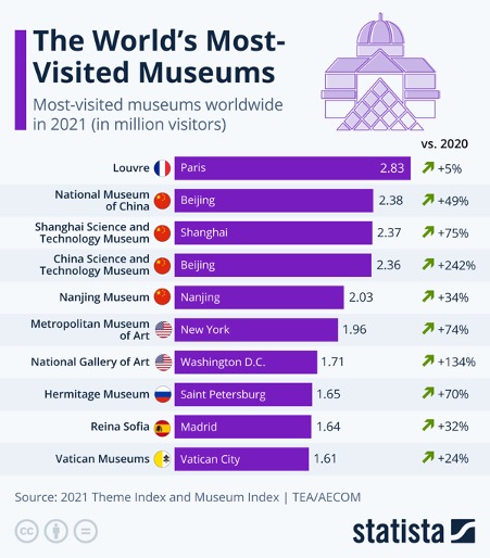 China Science and Technology Museum (Muzeul Chinez de Știință și Tehnologie) din Beijing a avut o rată de creștere chiar și mai mare, dar deși muzeele din China cresc mult înspre pozițiile de top din clasament, Muzeul Luvru continuă să își apere poziția de cel mai vizitat muzeu al lumii. Anul trecut muzeul din Paris a avut 2.83 de milioane de vizitatori.