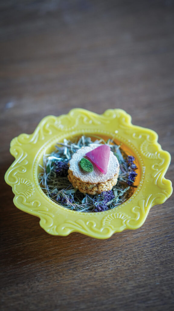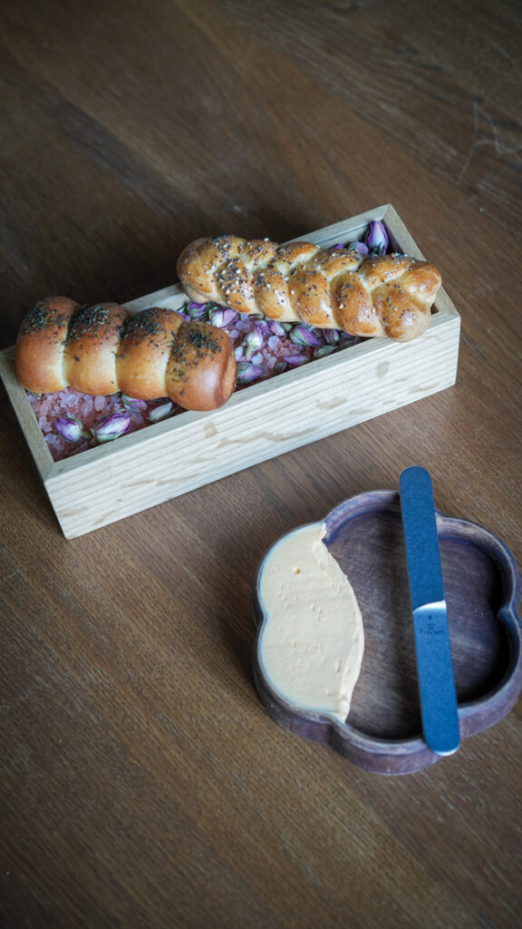 Identitatea éto stă în coerența și emoția întregului meniu. Preparatele aparent simple, dar construite pe memorie și cercetare reală ne reprezintă cel mai bine – farfurii în care există emoție, dar și structură. În fiecare meniu alegem însă să aducem în lumină câteva ingrediente sau gesturi care spun ceva esențial despre noi. Încă de la început, am ales să atragem discret atenția asupra albinelor – ca piloni ai sustenabilității și ai echilibrului alimentar. În restaurant modelăm manual vase din ceară brută, un material viu, imperfect, care poartă în el ideea de fragilitate și responsabilitate. În meniul HORA, aceste două direcții se întâlnesc chiar în primul snack: un aluat crocant cu unt și pudră de roșii, pate de vită și murături, așezat pe un pat de flori uscate și fân, servit într-un bol din ceară.