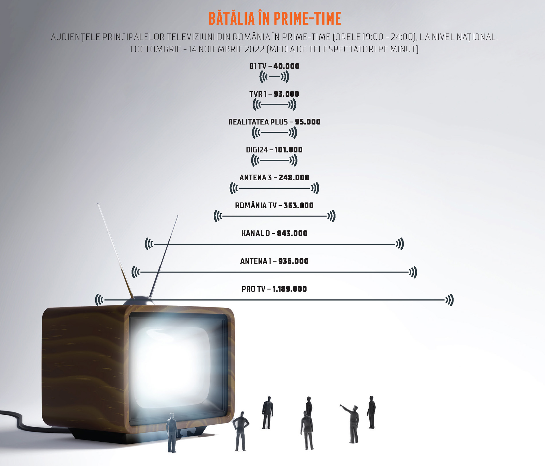 Publicul principalelor televiziuni comerciale și de știri din România a înaintat în vârstă. Așa-numitul target comercial (urban, 18-49 de ani) s-a micșorat. Tinerii nu sunt atrași de consumul TV pe telecomandă, fiind prizonierii mediului digital. În acest context, investitorii în publicitatea TV au o problemă: merită alocarea de publicitate în programe TV cu telespectatori bătrâni? Oare nu sunt bani aruncați pe „fereastră”? Mai cu seamă în perioada Sărbătorilor de Iarnă, chiar merită să-ți anunți prezența în calupurile publicitare de pe micile ecrane? Cât de bătrâni sunt telespectatorii marilor televiziuni comerciale de divertisment? Dar cei ai canalelor de știri?
