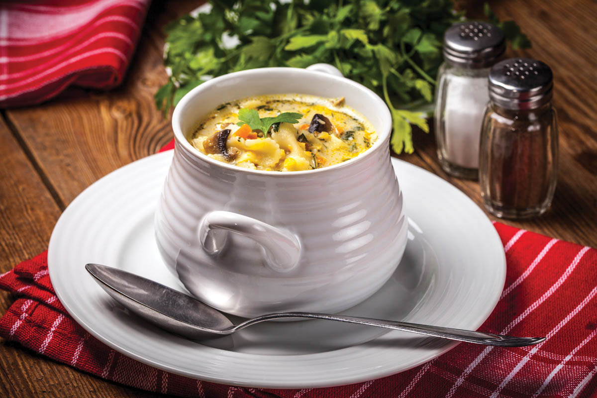 Servești ciorba caldă, cu pătrunjel verde deasupra.