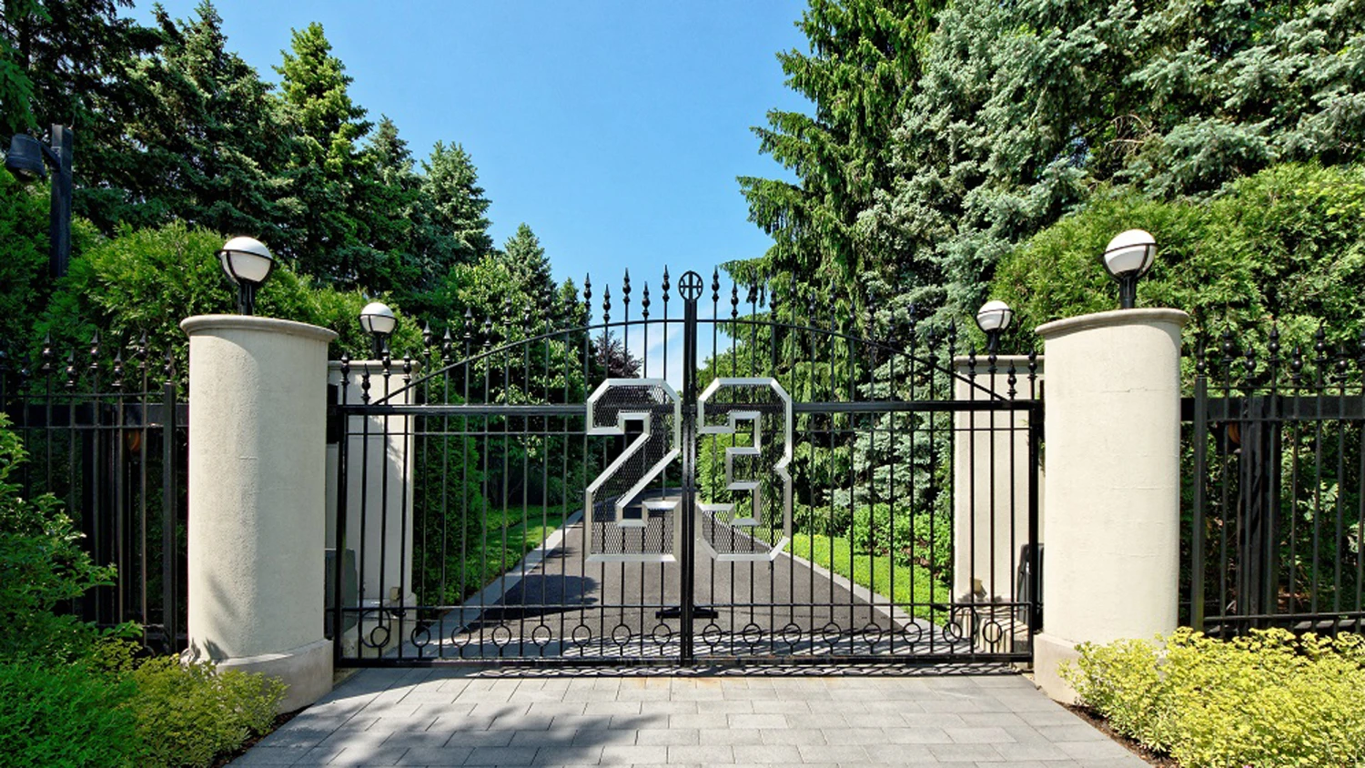 La intrarea pe proprietate, nici să vrei nu poți rata porțile pe care tronează numărul 23 – numărul tricoului de teren al lui Jordan, cu o însemnătate aparte pentru baschetbalist, care a stabilit de altfel ultimul preț al conacului la 14.855.000 de dolari, astfel încât cifrele adunate la un loc să însumeze exact 23, considerând probabil că numărul îi va purta la fel de mult noroc și în afara terenului de joc.