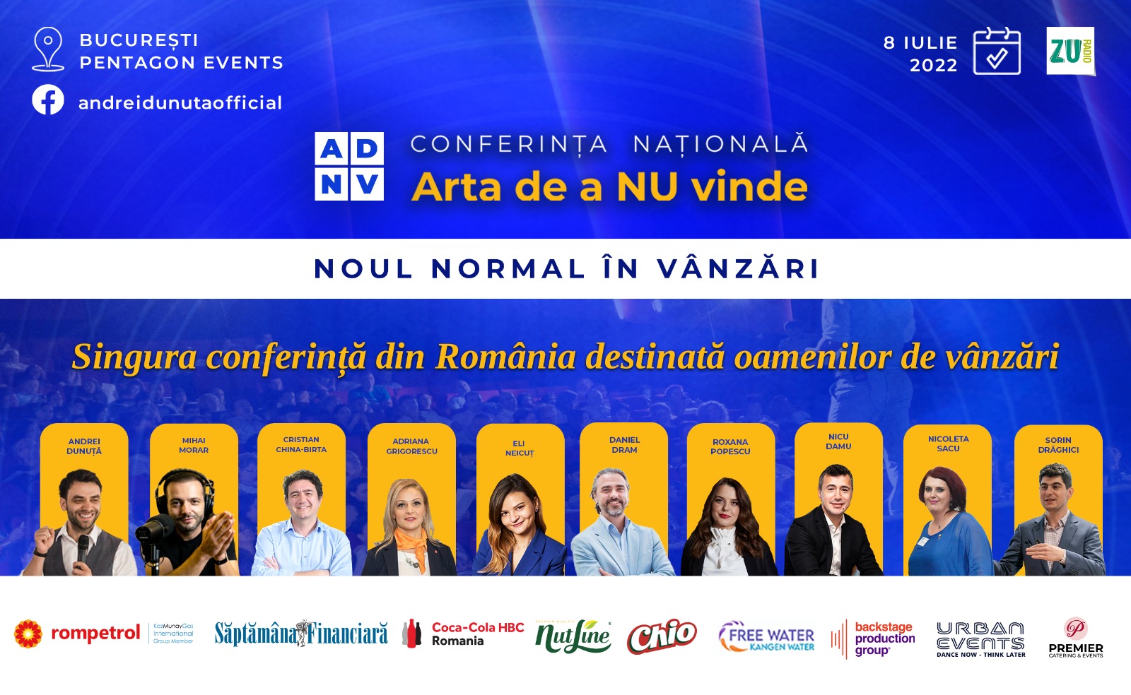Conferința “Noul normal învânzări” este sprijinită de: sponsorul Rompetrol, susținătorul Radio ZU și partenerii România TV, Săptămâna Financiară, Coca-Cola HBC, Nutline România, Chio România, Kangen Water, Premier Catering & Events, Individo, Chateau Vartely Winery, Shoteria, ProduseMoldovenești, Backstage Production Group, Urban Events.