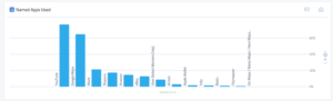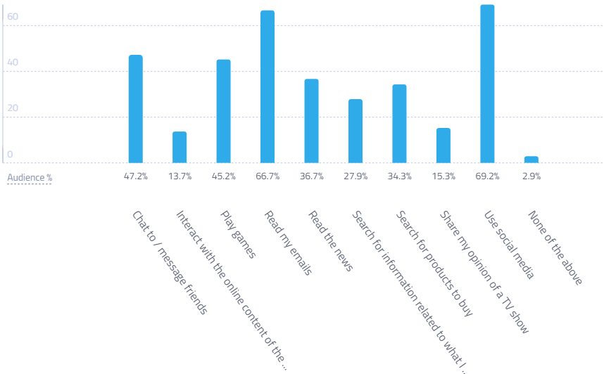 În ceea ce privește consumul digital în general, GlobalWebIndex arată că românii folosesc în cea mai mare măsură aplicațiile de social networking (92%), acestea fiind urmate de cele de chat și mesagerie (89%), navigație (71%), muzică (61%) și jocuri (54%), ultimul loc fiind ocupat de aplicațiile bancare pe care doar 34% dintre români declară că le folosesc.