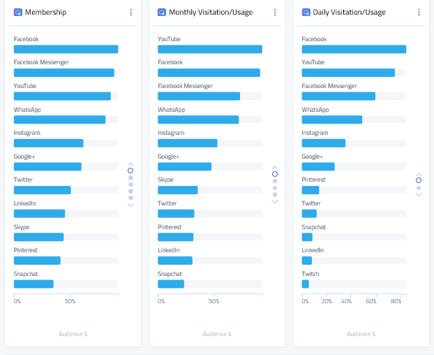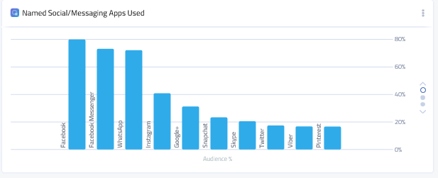 Dintre aplicațiile de social networking, Facebook conduce puternic în preferințele românilor cu 80%, fiind urmat de Facebook Messenger – 73%, aproape la egalitate cu WhatsApp, cu 72%.