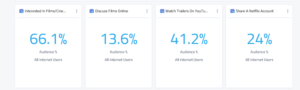 În ceea ce privește consumul de media, studiul relevă că 84% dintre românii conectați folosesc telefoanele mobile pentru a socializa sau pentru a-și verifica e-mailul în timp ce se uită la televizor. Și cu toate că 66% dintre cei intervievați declară că sunt interesați de filme, doar 41% se uită pe YouTube la trailere și doar 24% au un cont de Netflix (deși 40% spun că se uită la conținut pe Netflix, deoarece un cont poate fi împărțit de mai mulți utilizatori). Netflix este cea mai populară platformă de VOD pentru filme.