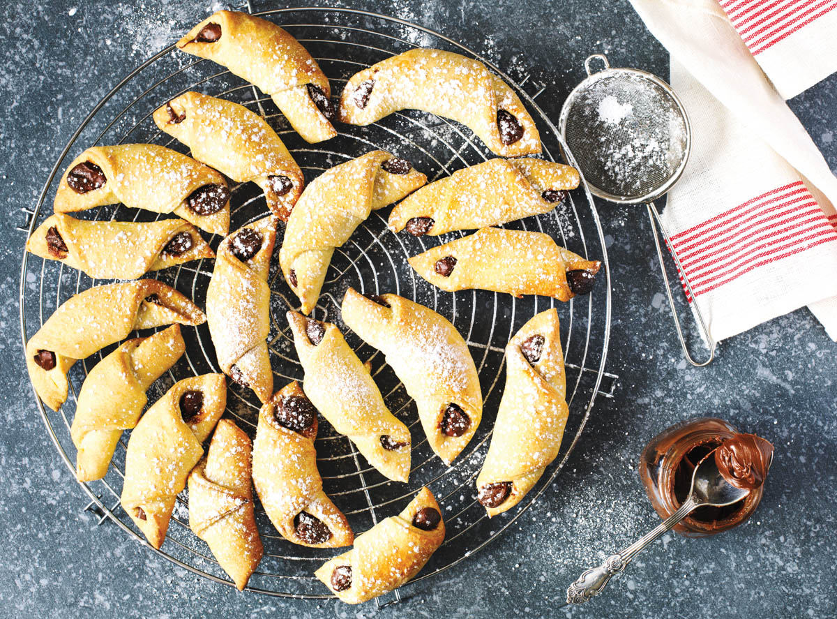 Tai foile pătrate mai mărișoare și la unul din colţuri așezi o linguriţă cu cremă de ciocolată și rulezi. Pui cornuleţele pe o tavă cu hârtie de copt și le introduci în cuptorul încins până se rumenesc frumos, 15-20 de minute. Le lași să se răcească bine și le păstrezi într-o cutie de carton.