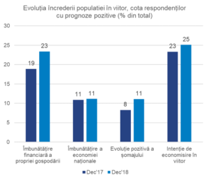 Indicatorul privind încrederea consumatorilor români este determinat de previziuni pesimiste la majoritatea capitolelor. Doar 11% cred într-o evoluție pozitivă a economiei și în același procent se așteaptă ca rata şomajului să scadă în următorul an. Cu toate acestea, românii arată ceva mai mult optimism atunci când vine vorba despre așteptările privind situaţia propriilor finanțe. Aproape un sfert dintre ei au încredere că aceasta va arăta mai bine, față de 19% anul anterior.