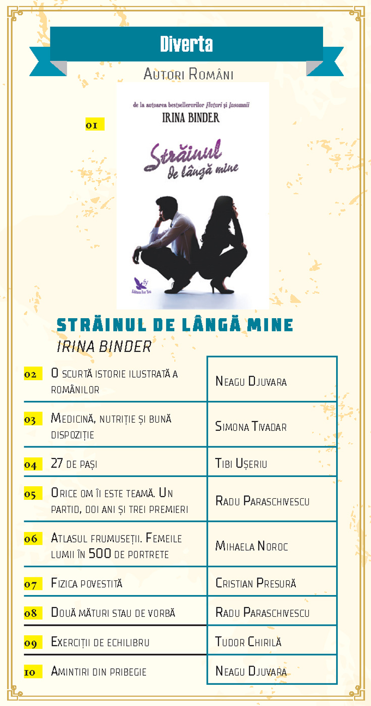 La secțiunea „autori români”, cea mai vândută carte în librăriile Diverta a fost romanul „Străinul de lângă mine” de Irina Binder. Pe următoarele două locuri în top s-au situat „O scurtă istorie ilustrată a românilor” de Neagu Djuvara și „Medicină, nutriție și bună dispoziție” de Simona Tivadar. Printre autorii români preferați de clienții Diverta s-au numărat: Radu Paraschivescu, Tudor Chirilă și Tibi Ușeriu.